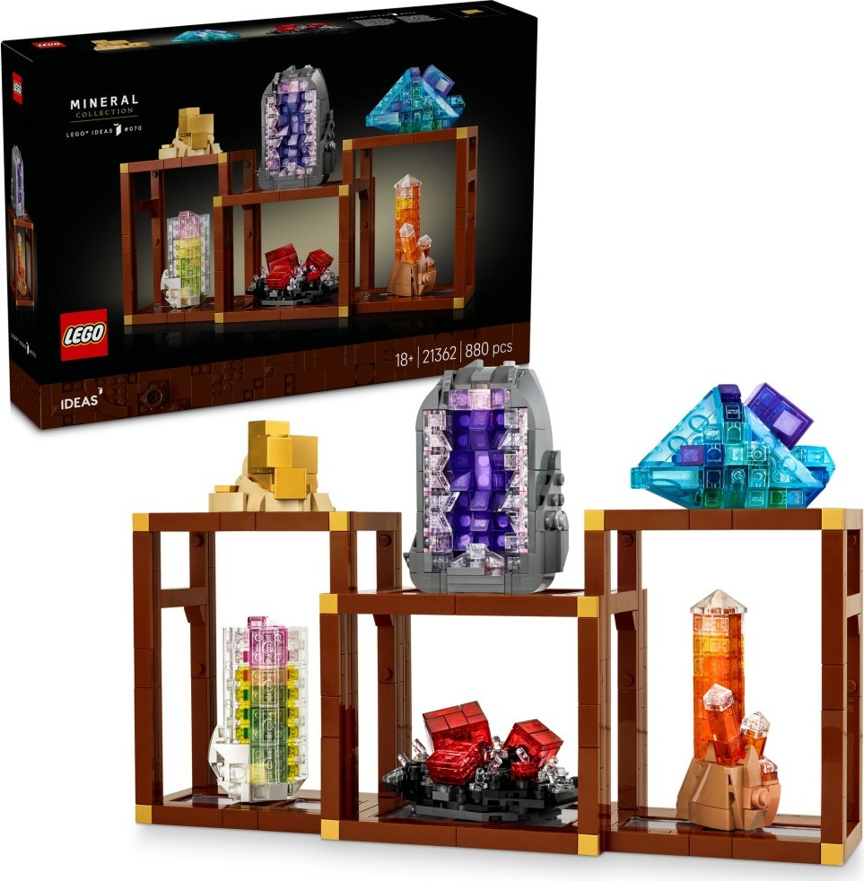 • Vystavte si krásné minerály s touto sběratelskou stavebnicí LEGO® Ideas • 6 sestavitelných minerálů včetně fialového ametystu a modrého fluoritu • Zachyťte měnící se barvy minerálů pomocí průhledných kostek LEGO® • Postavte si přizpůsobitelnou ozdobu do obývacího pokoje se třemi křišťálovými policemi • Nádherný dárek pro sběratele minerálů a milovníky přírody a umění • Stáhněte si aplikaci LEGO® Builder s interaktivními 3D návody na stavění • Stavebnice LEGO® Ideas navrhují a vybírají sami fanoušci • Tento výstavní model se skládá z 11 dílků a měří přes 28 cm na šířku.