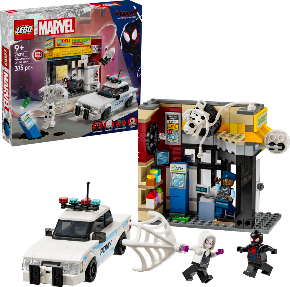 Sestavitelná stavebnice Spider-Verse – Stavebnice Spider-Verse: Miles Morales vs. Flek je navržená pro kluky a holky od 9 let a je inspirovaná filmem Spider-Man: Napříč paralelními světy od studia Marvel Minifigurky LEGO® Spider-Man – Stavebnice se Spider-Manem obsahuje minifigurky Milese Moralese, Fleka, Gwen Stacyové a strážníka Jeffersona a doplňky včetně pavučiny Stavebnice se superhrdinou – Funkce explodující zdi v samoobsluze umožňuje Flekovi ukrást bankomat a inspiruje k nekonečným nápaditým dobrodružstvím Sestavitelné policejní auto – Policejní vozidlo strážníka Jeffersona lze otevřít a umístit do něj 2 minifigurky Dárek se Spider-Manem pro děti – Fanoušci superhrdinů, vozidel a filmu Spider-Man: Napříč paralelními světy od studia Marvel si s touto stavebnicí LEGO® Marvel užijí nekonečné kreativní hraní 3D průvodce stavěním – Děti si můžou stáhnout aplikaci LEGO® Builder a vychutnat si pohlcující stavitelský zážitek s digitálními funkcemi přibližování a otáčení modelů ve 3D a možností ukládání stavebnic a zobrazení postupu ve stavění Sestavitelné hračky pro malé superhrdiny – Rozsáhlá řada stavebnic LEGO® Marvel dětem přináší neustále se měnící svět superhrdinských dobrodružství Stavebnice obsahuje 375 dílků – Model samoobsluhy měří přes 11 cm na výšku, 15 cm na šířku a 9 cm do hloubky.