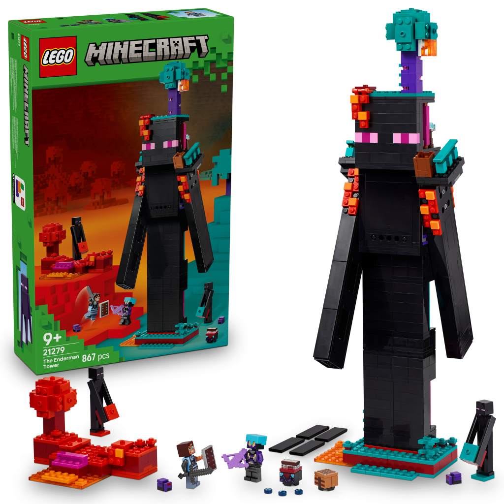 Kvalitní stavebnice Endermanova věž (21279) je ideální pro děti, které mají rády kreativní hraní a videoherní dekorace. Díky modulárnímu designu lze model přestavět a užít si nekonečné možnosti hraní a vystavování. Tato stavebnice LEGO® Minecraft® poslouží jako ideální dárek pro kluky a holky od 9 let. Hlavním modelem je věž ve tvaru Endermana s portálem do Netheru v hlavě, balkony na ramenou a 2 místnostmi s pracovním stolem, zaklínacím stolem a úložným boxem na perly z enderu. Vylezte po žebříku po noze modelu, prohlédněte si paže modelu, které jsou plně pohyblivé, a venku si prohlédněte prvky podivného a karmínového lesa. Stavebnice obsahuje minifigurku dimenzionálního obránce, nájezdníka říše a 2 Endermanů a 2 figurky mobů endermit. Mezi zbraněmi najdete kuši, netheritový meč a štít z Minecraftu. Endermanovu věž lze přestavět na 2 barevně odlišené pevnosti, což se skvěle hodí na PvP hry (hráč proti hráči). Stavějte model s aplikací LEGO® Builder. Stavebnice obsahuje 867 dílků.