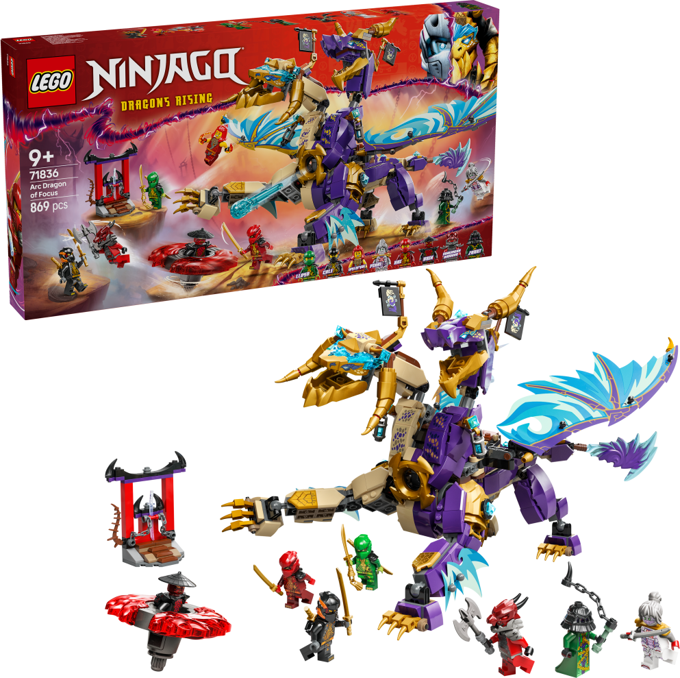 Hračka NINJAGO® s drakem pro děti – Se stavebnicí Drak soustředění Arc si kluci a holky od 9 let připomenou akční scény z 3. řady televizního seriálu NINJAGO Dračí povstání Polohovatelná figurka draka – Akční stavebnice Drak soustředění Arc má pohyblivý ocas, nohy, chodidla, hlavu, krk, čelist a drápy Interaktivní drak NINJAGO® – Děti aktivují vystřelovač v hrudi draka a rozpohybují jeho velká fóliová křídla pomocí páky na jeho zádech 8 minifigurek NINJAGO® – Tato stavebnice LEGO® obsahuje nindža válečníky Lloyda, Colea, Wyldfyre a Kaie a jejich spojenkyni Pixal a padouchy Drixe, Zarkta a dračího bojovníka Stavebnice se spinnerem – Součástí této stavebnice LEGO® je také Spinjitzu vozidlo, do kterého děti umístí minifigurku, kterou stisknutím tlačítka na odpalovači rychle vystřelí Dárek s nindžovskou tematikou pro děti – Tato stavebnice LEGO® představuje zábavný stavitelský a herní zážitek a poslouží jako skvělý dárek pro děti od 9 let, které milují akci s nindži Ještě větší dobrodružství s nindži – Prohlédněte si další akční stavebnice LEGO® NINJAGO® (prodávají se samostatně) s dalšími draky, chrámy a vozidly Svět hraček LEGO® NINJAGO® – Tato rozsáhlá kolekce stavebnic (prodávají se samostatně) dětem umožní ponořit se do světa fantazie a kreativně si hrát s nindžovskými hrdiny Rozměry – Tato stavebnice LEGO® NINJAGO® se skládá z 869 dílků a figurka Draka soustředění Arca měří přes 27 cm na výšku.