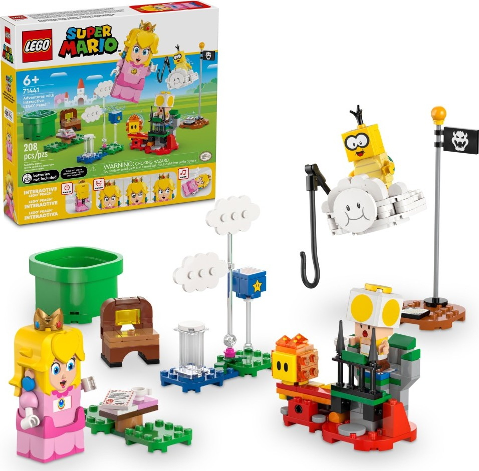Princeznovská stavebnice pro zábavná dobrodružství s interaktivní LEGO® Peach™ – Udělejte si piknikový čajový dýchánek s LEGO Peach a pomozte jí létat na Lakitově obláčku při záchraně Žlutého Toada 4 figurky LEGO® Super Mario™ – Tento set LEGO Nintendo® obsahuje interaktivní figurku LEGO® Peach™ a navíc Lakita, Žlutého Toada a Lava Bubble Dobrodružný set – Začněte u startovacího potrubí, udělejte si piknik, přečtěte si dopis, srazte Lakita z jeho obláčku, proleťte se na obláčku, porazte Lava Bubble a osvoboďte Žlutého Toada, než doběhnete k cílové vlaječce Zábavný obláček – Pomozte LEGO® Peach™ předvádět smyčky a salta na obláčku a získejte další digitální mince. Lakitu může pomocí obláčku také zaháknout piknikové křeslo a polapit Žlutého Toada Dárek Nintendo® pro děti – Tento dobrodružný set LEGO® Super Mario™ představuje zábavný princeznovský dárek pro holky, kluky a všechny hráče ve věku od 6 let Doprovodná aplikace LEGO® Super Mario™ – Stáhněte si aplikaci, která obsahuje návody na stavění, kreativní tipy a spoustu dalšího. Seznam kompatibilních zařízení s operačním systémem Android a iOS najdete na stránce LEGO.com/devicecheck Rozvíjení dětské fantazie – Sety LEGO® Super Mario™ umožňují samostatné i týmové hraní, přináší hodiny zábavy při hraní na postavy, sbírání digitálních mincí a zábavné možnosti v podobě rozšiřování a přestavování Rozměry – Modul obláčku v tomto setu z 208 dílků měří 11 cm na výšku, 11 cm na šířku a 7 cm do hloubky.