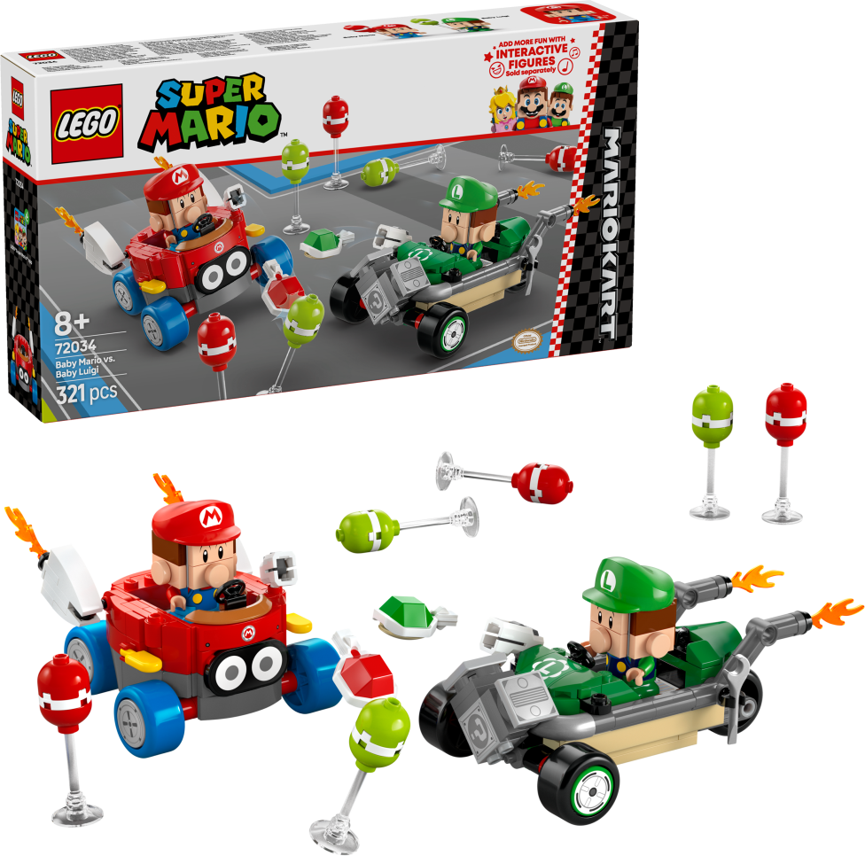 Set Mario Kart™ z kostek – Spojte síly s Baby Mariem nebo Baby Luigim a užijte si balónkové bitvy a závodní akci s tímto dobrodružným setem LEGO® Super Mario™ 2 sběratelské figurky Nintendo® pro zábavné hraní – Set obsahuje figurku Baby Maria a Baby Luigiho a 6 sestavitelných balónků (3 červené a 3 zelené) Autíčka Mario Kart™ – Umístěte Baby Maria do jeho Biddybuggy a Baby Luigiho na jeho Tri-Speeder a pokuste se převrhnout balónky střílením krunýřů Interaktivní hraní – Řiďte Biddybuggy nebo Tri-Speeder s figurkami LEGO® Mario™, LEGO® Luigi™ nebo LEGO® Peach™ (figurky nejsou součástí balení) a aktivujte zvukové a vizuální efekty Mario Kart™ troubení, driftování a další Tip na narozeninový dárek Mario Kart™ pro děti – Darujte tento set LEGO® Super Mario™ klukům, holkám a gamerům od 8 let. Pro interaktivní hraní je potřeba set 71439, 71440 nebo 71441 (prodávají se samostatně) Sběratelský předmět Nintendo® – Prozkoumejte řadu setů LEGO® Super Mario™: Mario Kart™ (prodávají se samostatně) a objevte další vozidla a postavy, se kterými můžete závodit a vymýšlet další příběhy Rozvíjení dětské fantazie – Sety LEGO® Super Mario™ umožňují samostatné i týmové hraní, přináší hodiny zábavy při hraní rolí, sbírání digitálních mincí a kreativní možnosti v podobě rozšiřování a přestavování Rozměry – Set se skládá z 321 dílků a každý model auta měří přes 5 cm na výšku, 10 cm na délku a 7 cm na šířku.