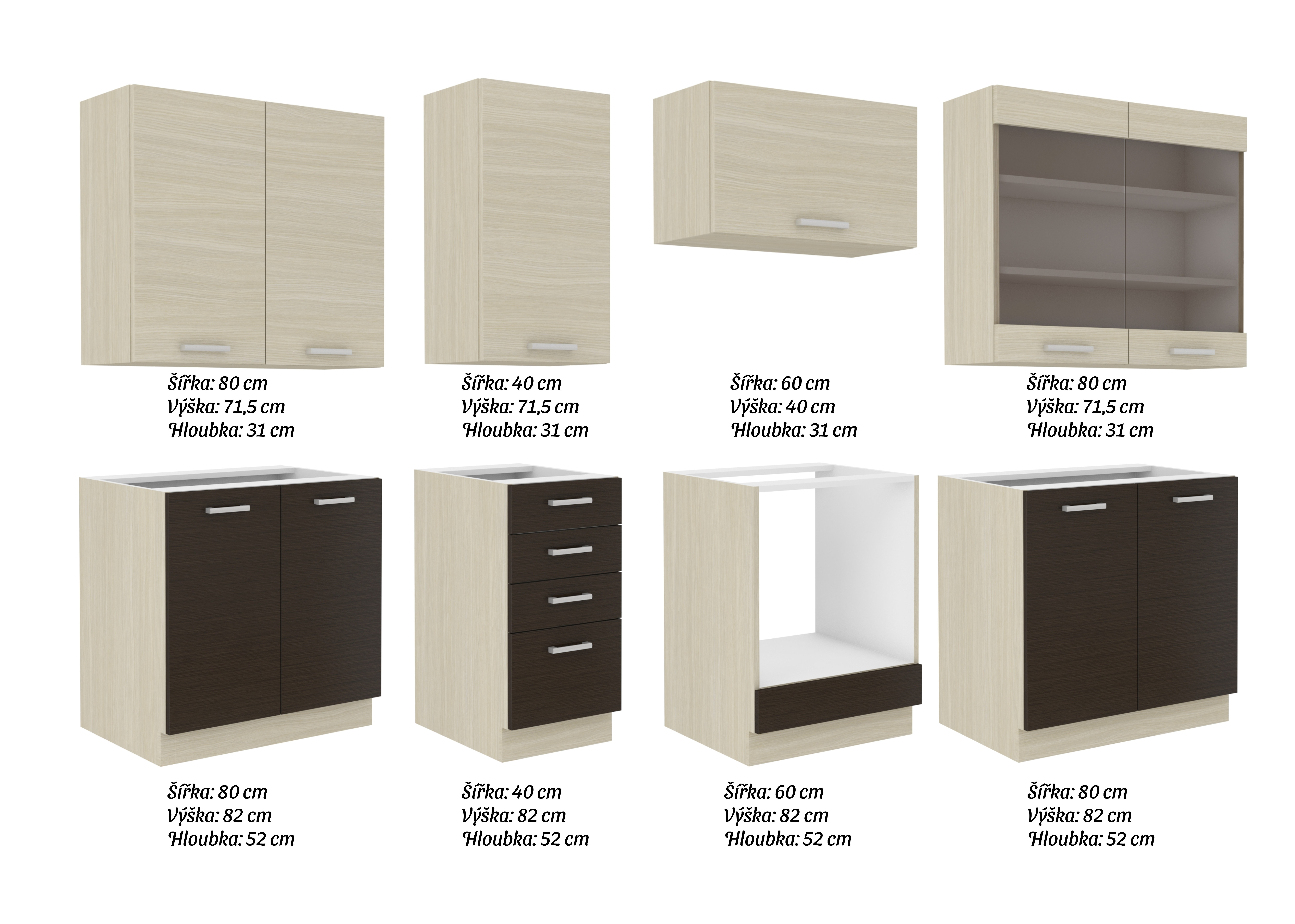 Kuchyňská linka Chamonix 1 Kuchyňská linka Chamonix 1 je prostorná a praktická, s nevšední kombinací barevného dekoru. Všechny skříňky jsou variabilní, což umožňuje jejich libovolné umístění podle vašich potřeb. Ideální pro každého, kdo hledá moderní a flexibilní řešení do svého domova. Tato linka nabízí nejen funkčnost, ale i estetický vzhled, který oživí vaši kuchyň. • Barevná kombinace kuchyňské linky Chamonix 1 Dub ferrara Korpus a horní skříňky jsou ve světlém dekoru Legno tmavé Spodní skříňky jsou ve tmavém dekoru • Vlastnosti kuchyňské linky Chamonix 1 Korpus a dvířka Korpus je vyroben z laminované desky o síle 16 mm. Dvířka a čela zásuvek Dvířka a čela zásuvek jsou vyrobeny z MDF desek o síle 16 mm. Hrany desek Hrany opatřeny ABS hranou o síle 1 mm nebo dýhou. Úchytky Jednotlivá dvířka a zásuvky se otevírají pomocí plastových úchytek. BEZ tichého dovírání Dvířka a zásuvky NEJSOU opatřeny tichým dovíráním. Vnitřek skříněk Vnitřek skříněk je bílý. • Rozměry kuchyňské linky Chamonix 1 260 cm celková šířka 71,5 cm výška horních skříněk variabilní celková výška 60 cm hloubka spodních skříněk s pracovní deskou 82 cm výška spodních skříněk 31 cm hloubka horních skříněk Horní skříňky je možné umístit do libovolné výšky • Skříňky použité v této kuchyňské sestavě Horní skříňky1 x 80 G-72 2F1 x 40 G-72 1F1 x 60 OK-401 x 80 GS-72 2FSpodní skříňky1 x 80 ZL 2F BB1 x 40 D 4S BB1 x 60 D GAZ BB1 x 80 D 2F BB • Pracovní desky ke kuchyňské lince Pracovní deska není v ceně, ale je možné si jí dokoupit v libovolné délce a provedení.Potřebný rozměr pracovní desky pro tuto kuchyňskou linku je 260 cm. Dub Lancelot - 38 mm Zjistit více... Bílá - 28 mm Zjistit více... Nubian - 28 mm Zjistit více... Dub Artisan - 38 mm Zjistit více... • Montážní závěsná lištaMontážní lišta je chytré řešení pro efektivní a snadnou instalaci horních skříněk ve vaší kuchyni nebo jiných prostorách. Nejprve se lišta upevní ke zdi, což zajistí stabilní a rovný základ pro následné zavěšení skříněk. • Odkazy na příslušenství ke kuchyňským linkámPracovní deskyPříslušenství ke kuchynímKompletní nabídka skříněk ke kuchyňské lince Chamonix •