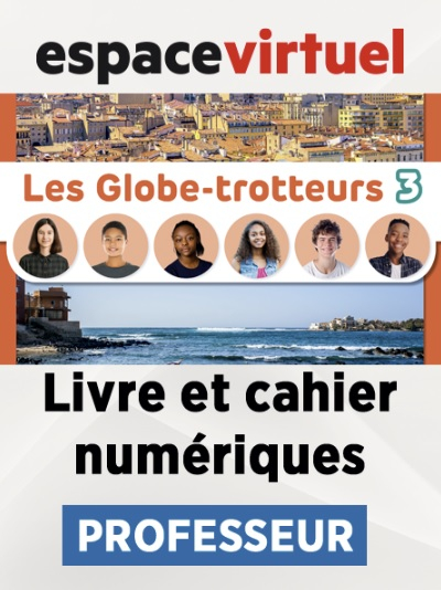 Cette proposition 100 % numérique de Les Globe-trotteurs 3 est la solution idéale pour un enseignement qui tire le meilleur parti des outils numériques, que ce soit dans le cadre d’un cours en présentiel, hybride ou en ligne. Avec Les Globe-trotteurs 3 Livre et Cahier numériques (12 mois), accédez à : votre livre et votre cahier numériques interactifs toutes les ressources associées à Les Globe-trotteurs 3 (audios, vidéos, exercices autocorrectifs…) Tous nos livres numériques sont sur Espace virtuel, la plateforme numérique dédiée à l’enseignement du français ! Planifiez, animez et gérez vos classes facilement grâce aux nombreuses fonctionnalités offertes par la plateforme : création de groupes d’élèves, messagerie instantanée, système de visioconférence, suivi des progrès des élèves, envoi de devoirs personnalisés, évaluation… En savoir plus sur Espace virtuel. Vos élèves utilisent Espace virtuel ? Pour vous c’est GRATUIT ! Si vous avez au moins un groupe de 6 élèves qui utilisent Les Globe-trotteurs 3 Livre et Cahier numériques, vous obtenez automatiquement votre accès gratuit ! Les Globe-trotteurs 1 est un composant de la collection Les Globe-trotteurs, la méthode FLE pour adolescents qui s’adapte à tous les contextes d’enseignement. Une progression en douceur qui fonctionne parfaitement avec tous les types de volume horaire, les différents temps de concentration des élèves… Les possibilités offertes par le numérique sont pleinement exploitées, avec des activités numériques interactives et une offre abondante de matériel complémentaire. Des unités organisées autour de la vie d’un adolescent francophone, de sa ville, sa région ou son pays : un concept qui permet de mêler centres d’intérêts des apprenants avec découvertes culturelles et travail de la langue Une attention particulière portée à l’hétérogénéité des apprenants : des audios à plusieurs vitesses, leurs transcriptions, des évaluations (diagnostiques, par unité, trimestrielles, annuelles) proposées avec deux degrés de difficulté et du matériel de renforcement des contenus grammaticaux et lexicaux Une mise en page épurée, une organisation simple, des étapes d’apprentissage clairement balisées et énoncées qui rassurent l’apprenant et lui permettent une plus grande autonomie Une réelle prise en compte de l’accessibilité : polices de caractères et code couleurs adaptés, iconographie simple et efficace…