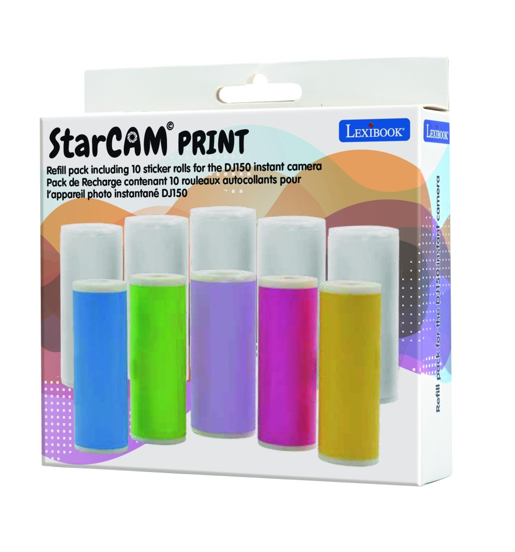 Lexibook nabízí náhradní sady v podobě 10 rolí samolepek určených pro fotoaparáty řady DJ150. Tyto náhradní role jsou kompatibilní s instatními fotoaparáty StarCAM PRINT, které umožňují okamžité vytištění fotografií ve formě samolepek. Každá role je navržena tak, aby se snadno vkládala do fotoaparátu a poskytovala rychlé a jednoduché možnosti tisku. Tento produkt je určen pro děti a mládež, kteří rádi zachycují své zážitky a vytvářejí z nich jedinečné samolepky. Sada obsahuje celkem 10 samolepicích rolí, z nichž polovina je bílá a druhá polovina barevná s pěti různými odstíny – modrá, zelená, fialová, růžová a žlutá. Barevné role tak umožňují kreativní zdobení fotografií nebo jejich rámování různými barvami. Role mají typický válcovitý tvar a jsou vyrobeny z materiálu vhodného pro tisk samolepek, které jsou zároveň odolné a snadno přilepitelné na různé povrchy. Balení je vyvedeno v moderním designu s barevnými abstraktními vzory a jasným označením kompatibility s fotoaparátem DJ150. Na zadní straně obalu jsou uvedeny informace v několika jazycích, které vysvětlují, že role slouží k tisku samolepek o rozměrech 2,2 x 11,7 cm. Produkt je certifikován a není hračka, což upozorňuje na bezpečnostní normy. Tato náhradní sada je vhodným doplňkem pro uživatele fotoaparátů Lexibook DJ150, kteří chtějí pokračovat ve tvorbě tištěných samolepících fotografií bez přerušení. Celkově je tato sada náhradních rolí praktickým a barevným řešením pro okamžitý tisk samolepek, které podpoří kreativitu a zábavu při fotografování a sdílení zážitků. Díky jednoduchému vkládání a kompatibilitě s vybranými modely fotoaparátů usnadňuje uživatelům rychlé a bezproblémové doplnění materiálu pro tisk.