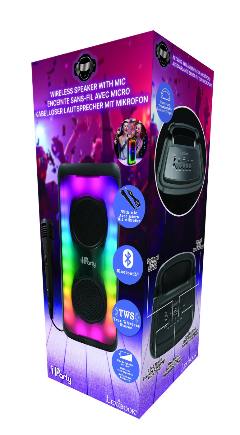 Lexibook bluetooth karaoke reproduktor s mikrofonem velký je elektronické zařízení určené pro děti, které podporuje rozvoj fantazie a kreativity prostřednictvím hudební zábavy. Tento reproduktor je vybavený dvěma kulatými reproduktory na přední straně, které jsou obklopeny výrazným LED osvětlením s devíti barevnými režimy. Světelné efekty vytvářejí živou a zábavnou atmosféru, ideální pro karaoke večírky a rodinné oslavy. Celé tělo reproduktoru je černé, s robustním designem a praktickým madlem pro snadné přenášení. K reproduktoru je připojený kabelový mikrofon s jednoduchým ovládáním zapnutí a vypnutí, což umožňuje snadné použití i mladším dětem. Mikrofon má 3,5mm jack konektor a je součástí balení spolu s USB kabelem pro dobíjení a audio kabelem pro připojení dalších zařízení. Na zadní straně reproduktoru se nachází ovládací panel, kde jsou umístěny tlačítka pro přepínání režimů, ovládání hlasitosti a přehrávání, dále USB port, TF karta a AUX vstup. Reproduktor podporuje bezdrátové připojení přes Bluetooth, což umožňuje snadné streamování hudby z mobilních zařízení. Díky technologii TWS (True Wireless Stereo) lze propojit více reproduktorů pro prostorovější zvukový zážitek. Vestavěná dobíjecí NiMH baterie je součástí balení, což zajišťuje dlouhou výdrž a mobilitu bez nutnosti připojení k elektrické síti. Tento produkt je zařazen do kategorie elektroniky pro děti a elektronické zábavy, a je vhodný pro všechny malé i větší zpěváky, kteří chtějí zažít autentickou karaoke show přímo doma.