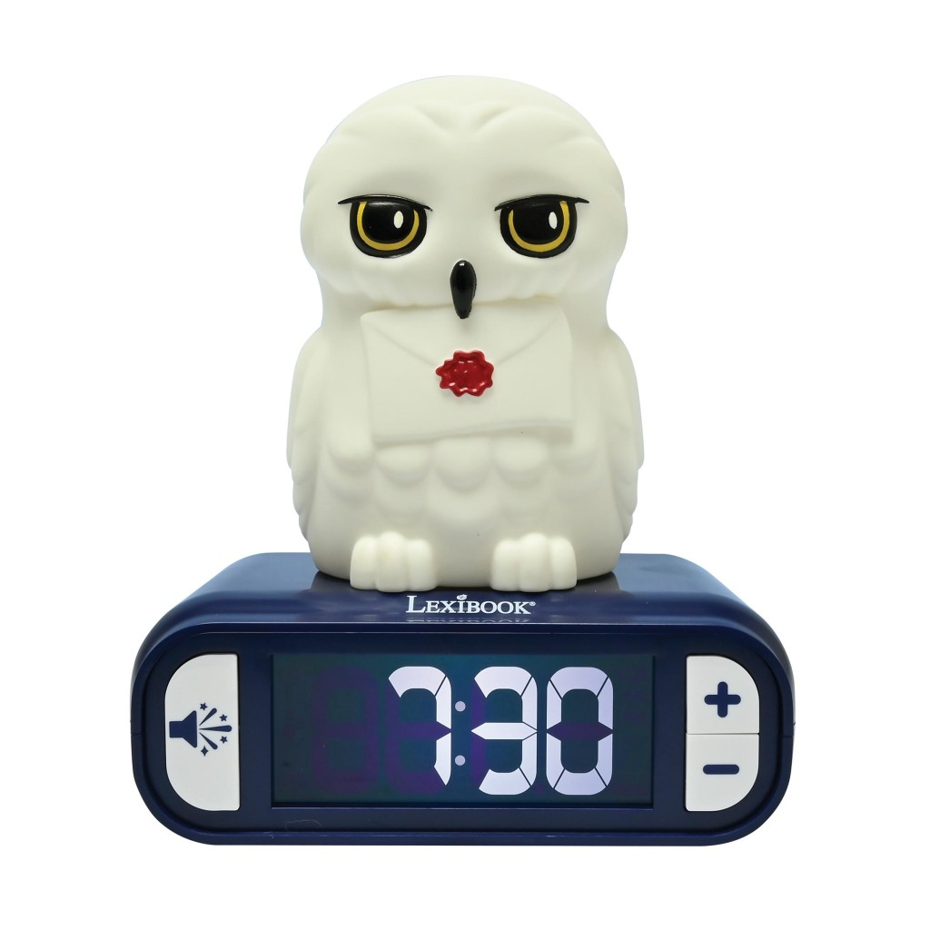 Budík Lexibook Hedvika se svítící figurkou je tematicky inspirován světem Harryho Pottera a je ideálním dárkem pro fanoušky této série, zejména pro děti. Hlavní vizuální prvek tvoří bílá figurka sovy Hedviky, která drží v zobáčku dopis se zřetelnou červenou pečetí. Tato figurka zároveň slouží jako noční světlo, které jemně osvětluje prostor kolem budíku, což je užitečné při usínání nebo pro noční orientaci v pokoji. Celý budík stojí na tmavě modrém podstavci s digitálním displejem, který zobrazuje čas v jasně bílých číslech, což zajišťuje dobrou čitelnost i za tmy. Digitální displej budíku je doplněn tlačítky pro snadné nastavení času a hlasitosti, umístěnými po stranách podstavce. Na levé straně se nachází tlačítko pro zapnutí a vypnutí zvuku nebo melodie, zatímco na pravé straně se nacházejí tlačítka pro zvýšení a snížení hodnot. Budík je napájen třemi bateriemi typu AA, které nejsou součástí balení, což umožňuje jeho flexibilní umístění bez nutnosti připojení k elektrické síti. Budík disponuje funkcí hlasitého budíku se zvuky a melodiemi, které pomáhají dětem vstávat příjemným způsobem. Svítící figurka Hedviky navíc vytváří uklidňující atmosféru, která může dětem pomoci lépe usnout. Celkově produkt kombinuje praktickou funkci budíku s oblíbeným motivem z Harryho Pottera, což z něj činí nejen užitečný nástroj pro každodenní použití, ale i dekorativní prvek dětského pokoje. Balení je navrženo tak, aby byl budík dobře viditelný a zároveň chráněný, což usnadňuje jeho prezentaci v prodejně.