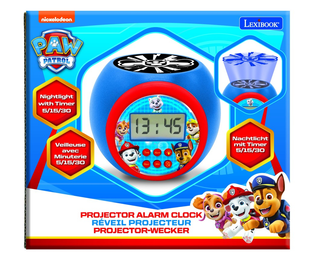 Budík Lexibook s motivem Tlapkové patroly je určený především dětem a kombinuje funkčnost s oblíbenými postavičkami ze seriálu. Zaoblený design budíku je laděný do modré barvy s červeným rámečkem kolem digitálního displeje, který zobrazuje čas ve 24hodinovém formátu. Na čelní straně jsou vyobrazeny hlavní postavičky Paw Patrol, které dětem zpříjemní každé probuzení. Displej je podsvícený modrým světlem, které usnadňuje čtení času i za snížené viditelnosti. Výjimečnou funkcí tohoto budíku je projektor umístěný na horní části přístroje, který promítá na strop ikonický symbol tlapky z Tlapkové patroly. Projektor nabízí možnost výběru ze tří barevných režimů projekce – modrá, červená a oranžová, což umožňuje vytvořit příjemnou atmosféru v dětském pokoji. Navíc je možné nastavit časovač automatického vypnutí projekce na 5, 15 nebo 30 minut, což je praktické při usínání. Budík také disponuje standardními funkcemi, jako je nastavení času, budíku s možností opakovaného buzení (snooze funkce), a tlačítky pro ovládání hodin a alarmu. Napájen je třemi AAA bateriemi, které nejsou součástí balení. Díky kompaktním rozměrům a jednoduchému ovládání je ideální pro děti, které se učí orientovat v čase a potřebují spolehlivý budík s přidanou zábavnou funkcí. Celkově jde o praktický a vizuálně atraktivní doplněk dětského pokoje s motivem populární Tlapkové patroly.