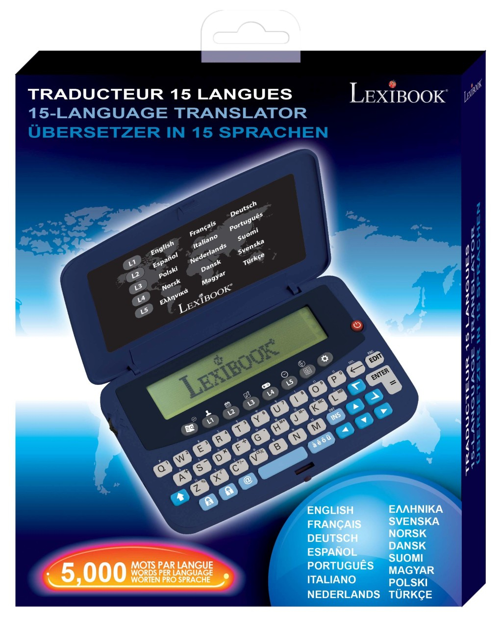 Elektronický kapesní překladač Lexibook je určený pro děti a slouží jako praktická pomůcka při učení cizích jazyků. Tento překladač podporuje až 15 jazyků, mezi které patří mimo jiné angličtina, francouzština, němčina, španělština, polština, italština, portugalština, nizozemština, řečtina, švédština, turečtina a další. Zařízení je vybaveno pamětí obsahující přibližně 5 000 slov pro každý jazyk, což umožňuje uživatelům snadno najít překlad a rozšířit si slovní zásobu. Překladač má kompaktní a robustní konstrukci v tmavě modré barvě s klávesnicí, která je ergonomicky uspořádaná pro pohodlné psaní. Na vnitřní straně víka je přehledný seznam podporovaných jazyků, což usnadňuje výběr požadovaného jazyka. Displej je monochromatický a zobrazuje text jasně čitelným písmem. Ovládání je jednoduché díky tlačítkům s označením funkcí, včetně tlačítek pro rychlý přístup k jednotlivým jazykům. Přístroj je napájen jednou CR2032 baterií, která je součástí balení. Překladač Lexibook je vhodný nejen pro děti, které se učí cizí jazyky ve škole, ale také pro cestovatele či všechny, kteří potřebují rychlý a přehledný překlad. Zařízení spadá do kategorie elektronické zábavy a elektroniky pro děti, což reflektuje jeho edukační a zároveň praktický charakter. Díky své velikosti a jednoduchému designu je snadno přenosný a ideálně se hodí do kapsy nebo batohu. Celkově je Lexibook elektronický kapesní překladač vyroben z kvalitního plastu, který zajišťuje odolnost při každodenním používání. Na zadní straně je umístěný kryt baterie a tlačítko reset, které umožňuje rychlé obnovení zařízení do továrního nastavení. Překladač je dodáván v modrém obalu s jasným označením funkcí a jazykových možností, což usnadňuje orientaci a výběr produktu v obchodě.