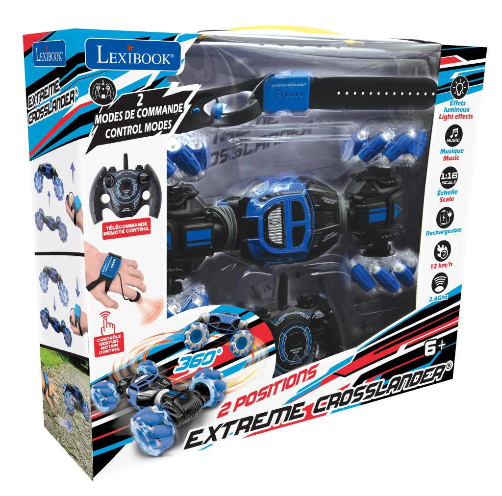 Lexibook kaskadérské auto Extreme Crosslander představuje inovativní dálkově ovládané vozidlo, které vyniká svým moderním designem a pokročilými funkcemi. Auto je zhotoveno v kombinaci černé a modré barvy s průsvitnými modrými koly, která jsou vybavena LED světelnými efekty. Tyto světelné prvky nejenže zvyšují atraktivitu auta, ale umožňují také jízdu ve tmě nebo při horších světelných podmínkách. Vozidlo je vyrobeno z pevného plastu, což zajišťuje odolnost při náročnější jízdě či při kaskadérských prvcích. Unikátní vlastností tohoto modelu je možnost přepínání mezi dvěma jízdními režimy – Stunt Mode a Racing Mode. V režimu Stunt Mode se auto dokáže otáčet o 360°, což umožňuje provádět různé kaskadérské triky a efektní otočky. Racing Mode zase nabízí plnou rychlost až 12 km/h, což ocení děti při závodění. Ovládání vozidla je možné dvěma způsoby – klasickým dálkovým ovladačem nebo pomocí speciálního snímače pohybu, který se nosí na ruce. Tento snímač umožňuje ovládat auto gesty, což přináší zcela nový zážitek z jízdy a větší interaktivitu. Auto je vybaveno dobíjecí baterií, která je součástí balení, a jeho provoz je podporován dvěma AA bateriemi (nejsou součástí balení) pro ovladač. Díky bezdrátové technologii 2,4 GHz je zajištěna stabilní komunikace mezi vozidlem a ovladačem na vzdálenost vhodnou pro venkovní i vnitřní použití. Měřítko modelu je 1:18, což představuje ideální velikost pro snadné ovládání a přitom dostatečnou viditelnost detailů. Celkově je Lexibook kaskadérské auto Extreme Crosslander určené pro děti od 6 let, které si rády vyzkoušejí rychlou jízdu i kaskadérské kousky. Vozidlo nabízí zábavu nejen díky pohybu, ale také díky hudebním doprovodům a světelným efektům, které jsou integrovány do kol. Díky svému robustnímu provedení a možnosti ovládání gesty představuje ideální volbu pro malé nadšence do RC vozidel, kteří chtějí zažít něco víc než jen klasickou jízdu.