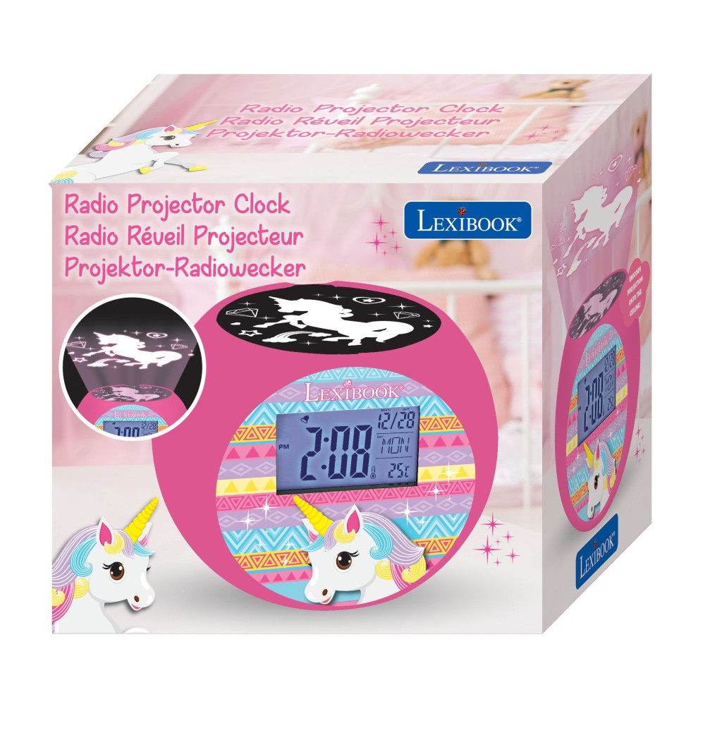 Radiobudík Lexibook s motivem jednorožce je navržený především pro děti, které ocení spojení praktického budíku s hravým a barevným designem. Zaoblený budík je převážně růžový a zdobí ho výrazný motiv jednorožce s duhovou hřívou, což mu dodává příjemný a přátelský vzhled vhodný do dětského pokoje. Přední část budíku obsahuje digitální displej, na kterém je přehledně zobrazen aktuální čas, datum i teplota v místnosti. Displej je podsvícený, což usnadňuje orientaci ve tmě. Jednou z hlavních funkcí tohoto budíku je vestavěný projektor, který promítá na strop nebo zeď siluetu jednorožce spolu s hvězdami a dalšími dekorativními detaily. Projekce je jemně růžová, což vytváří uklidňující atmosféru před usnutím a zároveň přináší zábavný vizuální prvek do dětského pokoje. Projektor je umístěn nahoře na budíku, odkud vyzařuje obrazec jednorožce s doprovodnými symboly. Budík je vybaven funkcí rádia, které může sloužit jako budící signál, nebo jako doprovodný zvuk při usínání. Napájen je jednou baterií typu CR2032, která je součástí balení, což zajišťuje okamžitou připravenost k použití bez nutnosti dokupování baterií. Díky kompaktním rozměrům a nenáročnému ovládání je radiobudík ideálním dárkem pro děti, které si chtějí zkrášlit svůj pokoj a zároveň mít praktického pomocníka pro nastavení času a budík. Celkově Lexibook radiobudík jednorožec s projektorem kombinuje funkčnost s hravým designem, který zaujme malé uživatele. Jeho barevné provedení a tematické prvky jej předurčují k použití v dětském pokoji jako oblíbený doplněk, který pomáhá dětem vstávat s radostí a zároveň vytváří příjemnou atmosféru při večerním usínání.