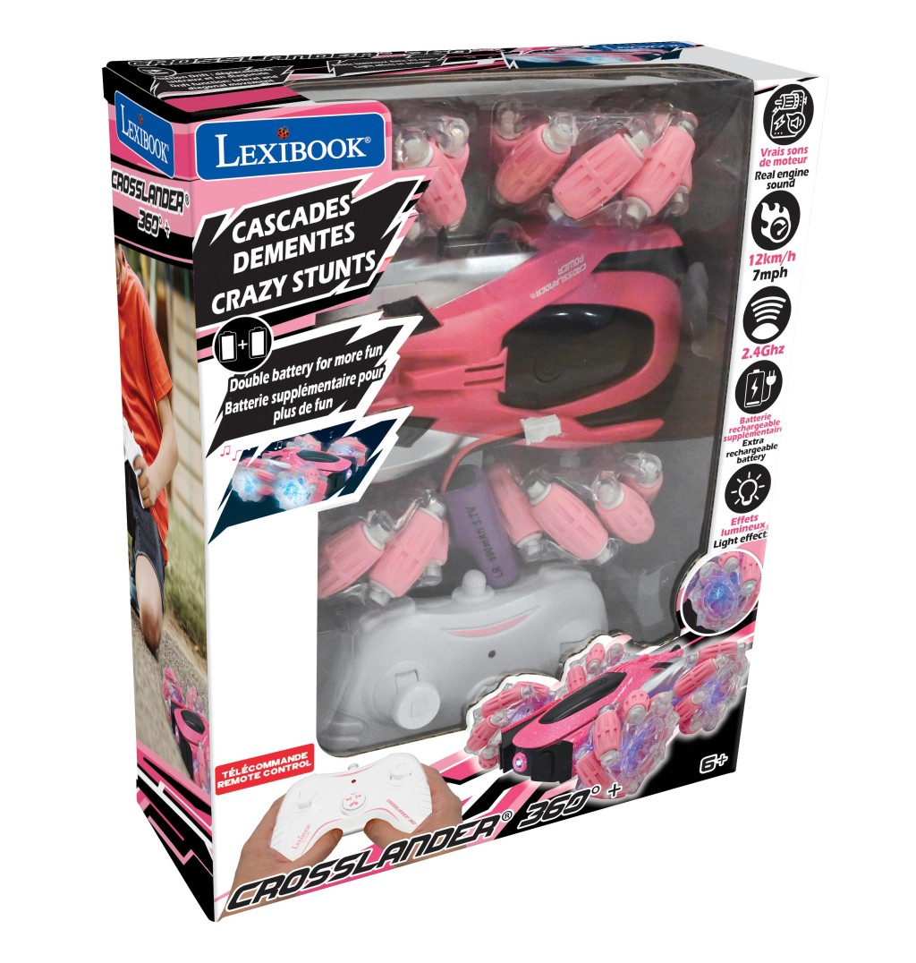 Lexibook růžové kaskadérské auto Crosslander 360°+ je dálkově ovládané vozidlo určené pro zábavu dětí od 6 let. Auto vyniká svým výrazným růžovým designem s lesklým povrchem a futuristickým tvarem, který zaujme na první pohled. Jeho speciální kola jsou tvořena z několika segmentů s průhlednými částmi, které během jízdy vytvářejí světelné efekty, což zvyšuje vizuální atraktivitu a zábavu při hraní. Vozidlo je vybaveno motorem, který vydává realistické zvuky, což přispívá k autentickému zážitku. Crosslander 360°+ nabízí unikátní funkce, které umožňují kaskadérské triky a akrobacie. Díky speciálním kolečkům dokáže auto provádět 360stupňové otočky, jízdu po dvou stranách („double face“) a boční drift, což rozšiřuje možnosti hraní a zvyšuje dynamiku. Ovládání je zajištěno pomocí ergonomického bílého dálkového ovladače, který komunikuje s vozidlem na frekvenci 2,4 GHz, což zaručuje spolehlivý a přesný přenos signálu. Auto dosahuje rychlosti až 12 km/h, což je dostatečné pro zábavnou a zároveň bezpečnou jízdu. V balení jsou zahrnuty dva dobíjecí akumulátory, které umožňují delší dobu hraní bez častého přerušování, protože jeden akumulátor lze nabíjet, zatímco druhý je v provozu. Pro napájení ovladače jsou potřeba dvě baterie typu AA, které však nejsou součástí balení. Celkově je Lexibook Crosslander 360°+ vhodný pro děti, které mají zájem o techniku a rády si užijí zábavu s dálkově ovládaným vozidlem, které nabízí více než jen klasickou jízdu. Díky svému robustnímu provedení a přizpůsobeným kolům je auto vhodné jak pro vnitřní, tak venkovní použití, jak ukazují fotografie dětí hrajících si s vozidlem na různých typech povrchu. Tento model je zařazen do kategorie vozidel s pohonem, což potvrzuje jeho schopnost pohybu a kaskadérských triků. Celkově se jedná o moderní a atraktivní RC auto, které přináší do světa dálkově ovládaných hraček nové možnosti zábavy a akčních jízd.