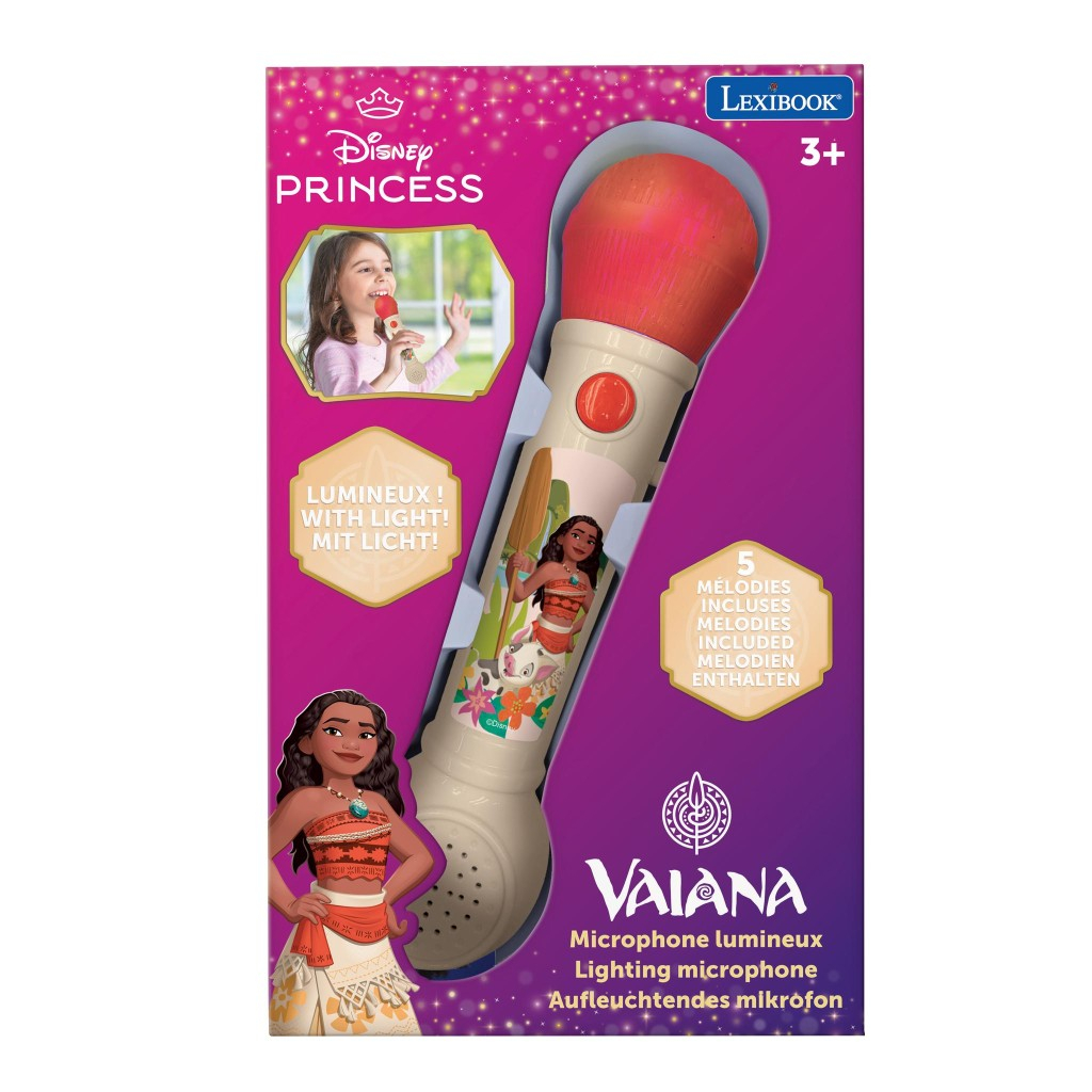 Lexibook svítící mikrofon Vaiana s melodiemi je dětská elektronická hračka určená pro děti od 3 let, která podporuje rozvoj fantazie a kreativity. Tento mikrofon je navržen s motivem populární Disney princezny Vaiany a je vyroben z pevného plastu v jemných krémových tónech s výrazně červenou hlavicí mikrofonu. Na těle mikrofonu je barevný obrázek Vaiany s dalším motivem květin a tropických rostlin, což z něj činí atraktivní doplněk pro malé zpěváky a fanoušky této postavy. Mikrofon je vybaven funkcí osvětlení, kdy červená hlavice mikrofonu při zapnutí svítí a dodává tak hrám a vystoupením živý efekt. Hračka obsahuje pět integrovaných melodií, které lze přehrávat, a umožňuje také aktivovat zvuk tlesknutí, což přináší interaktivní prvek a zábavu při zpěvu nebo hrách s kamarády. Ovládání je jednoduché, mikrofon má na těle jeden hlavní červený vypínač pro zapnutí a přepínání melodií, což usnadňuje používání i mladším dětem. Svítící mikrofon má délku přibližně 23 cm, což ho činí dobře přizpůsobeným pro dětské ruce. Napájení zajišťují dvě baterie typu AA, které nejsou součástí balení, což umožňuje snadnou výměnu a dlouhou dobu hraní. Díky svým funkcím a designu je tento mikrofon vhodnou volbou pro rozvoj hudebního cítění a schopností dětí, stejně jako pro zpestření dětských oslav nebo volného času. Celkově Lexibook mikrofon Vaiana kombinuje oblíbenou Disney tematiku s funkčností elektronické hračky, která podporuje kreativitu a zábavu dětí. Je ideální pro malé zpěváky, kteří si chtějí hrát a zároveň rozvíjet své hudební dovednosti v bezpečném a atraktivním provedení.