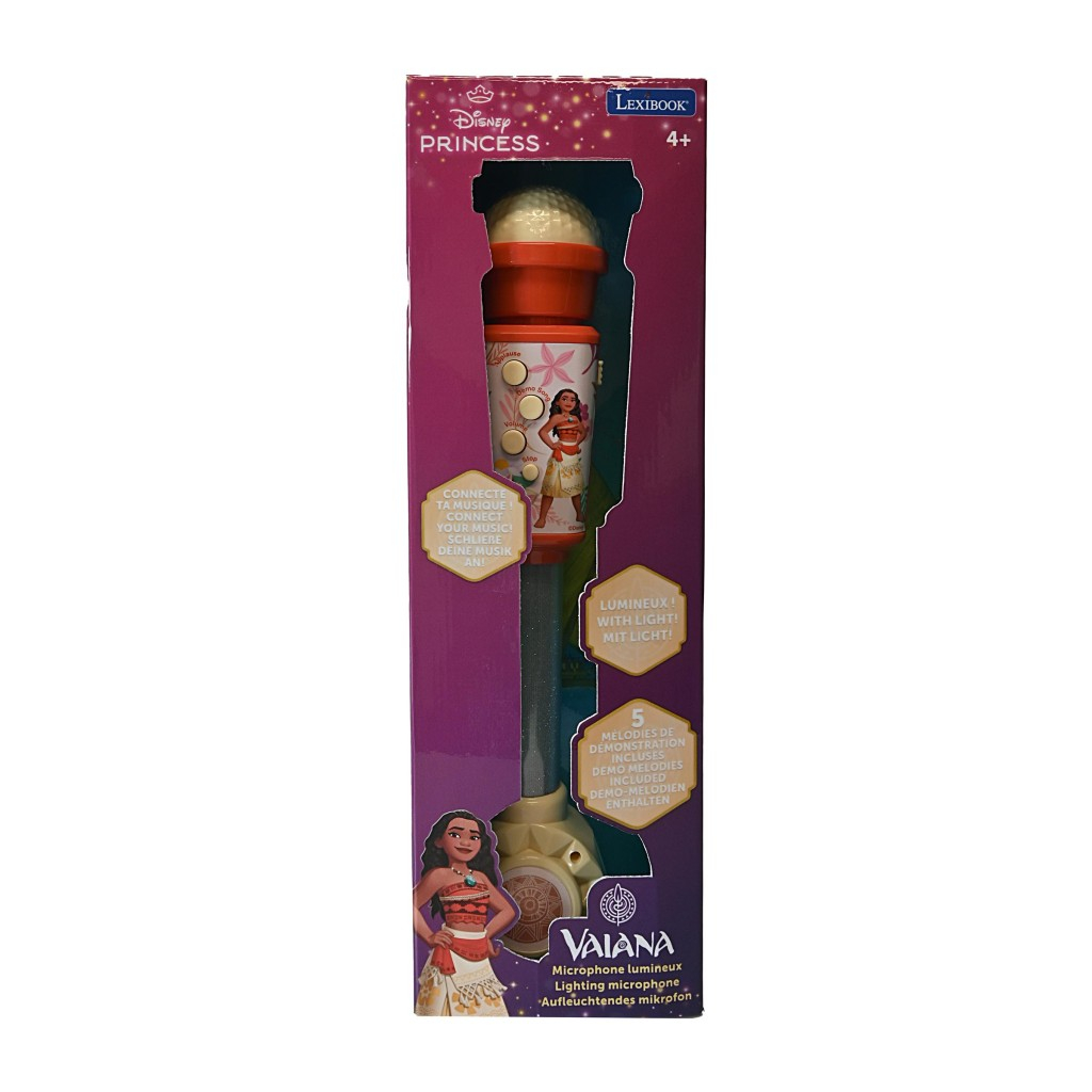 Lexibook svítící trendy mikrofon Moana je elektronická hračka určená dětem od 4 let, která podporuje rozvoj fantazie a kreativity. Tento mikrofon je inspirovaný populární postavou Moany z Disney filmu a je ozvláštněn veselou grafikou zobrazující hlavní hrdinku a její věrnou kočičí společnici. Mikrofon má klasický tvar s výrazně barevnou červenou hlavicí a transparentním modrým držadlem, ve kterém se třpytí světelné efekty. Díky nim hračka při použití přitahuje pozornost a dodává zpívání zábavnou atmosféru. Mikrofon nabízí několik funkčních tlačítek na přední straně, která umožňují ovládání různých módů. Děti mohou využít tlačítko pro tleskání, demo písničky, regulaci hlasitosti a zastavení přehrávání. Hračka obsahuje pět demo melodií, což umožňuje okamžitou zábavu bez nutnosti připojení. Pro rozšíření možností lze mikrofon připojit k externímu zdroji hudby pomocí audio kabelu, což umožní přehrávání oblíbených skladeb přímo přes reproduktor mikrofonu. Napájení je zajištěno dvěma AA bateriemi, které nejsou součástí balení. Mikrofon je vyroben z odolného plastu a jeho rozměry jsou přibližně 33 cm na délku, což je ideální velikost pro dětskou ruku. Na spodní části je dekorativní prvek s motivem slunce, který odkazuje na téma filmu Moana. Světelné efekty v držadle jsou výrazné a dodávají produktu moderní a hravý vzhled. Mikrofon je vhodný pro začínající zpěváky, kteří chtějí rozvíjet svůj hudební talent a zároveň si užívat interaktivní zábavu s oblíbenou postavou z Disney. Tato hračka je zařazena do kategorie elektronické zábavy pro děti a je vhodná pro všechny malé fanoušky Disney princezen. Díky kombinaci světelných efektů, přednastavených melodií a možnosti připojení externí hudby nabízí mikrofon zábavu na dlouhé hodiny a podporuje kreativitu a hudební dovednosti dětí. Je to ideální pomocník pro malé zpěváky, kteří si chtějí užít vlastní koncerty doma i na oslavách.