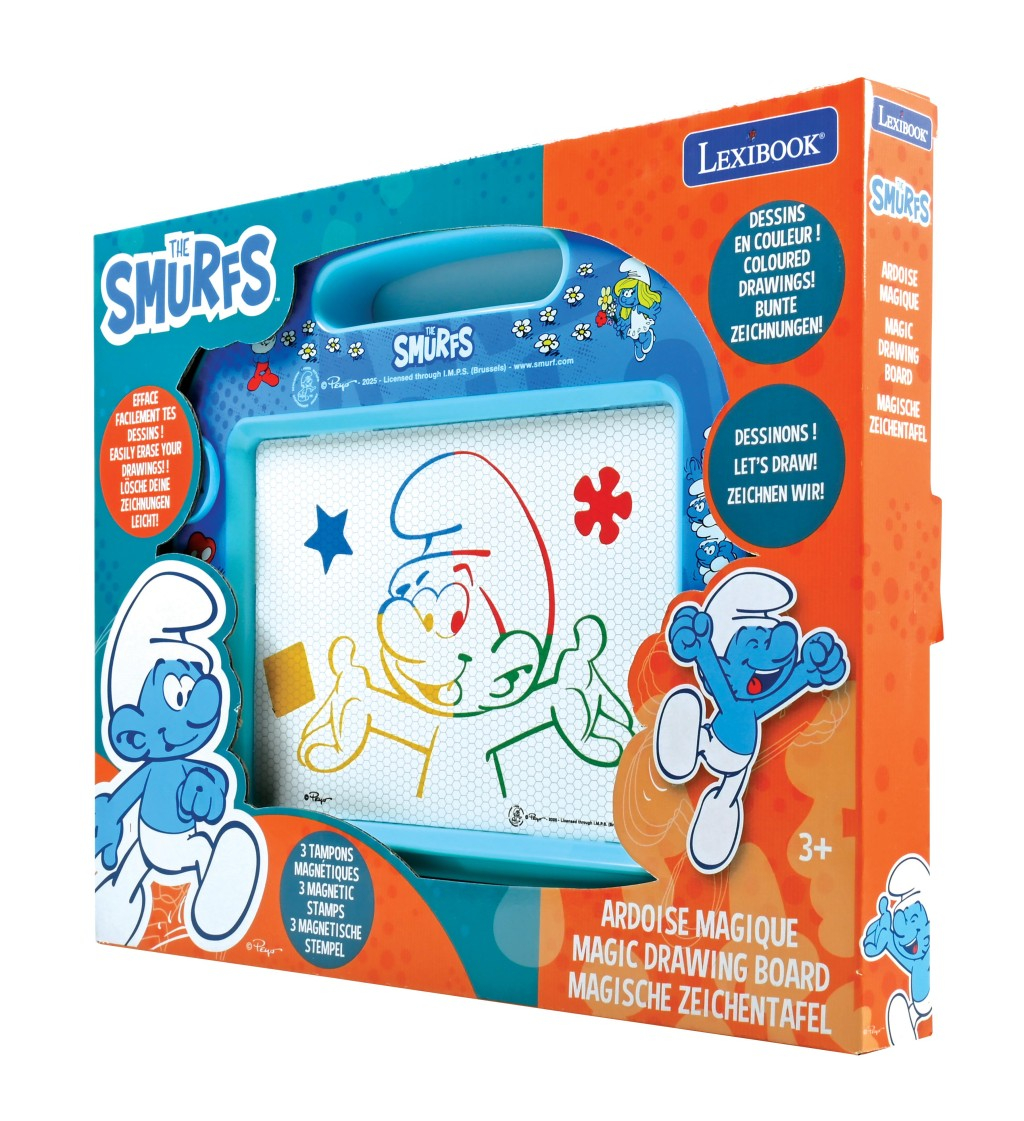 Lexibook vícebarevná kreslící tabulka Šmoulové je kreativní hračka určená pro děti od 3 let, která podporuje rozvoj fantazie a výtvarných dovedností. Tabulka má rozměry 32 x 23,5 cm a je vyrobena z odolného plastu v modré barvě, která je doplněna motivy oblíbených Šmoulů. Díky praktické rukojeti je snadno přenosná a umožňuje dětem kreslit a tvořit kdekoli. Povrch tabulky je speciálně navržený pro vytváření barevných obrázků pomocí magnetického pera, které je na tabulce připevněné šňůrkou, takže se neztratí. Kreslení je možné doplnit třemi různými magnetickými razítky ve tvaru hvězdy, květiny a čtverce, které děti mohou přikládat na plochu a vytvářet tak zajímavé tvary a motivy. Barevné linky na kreslicí ploše se objevují ve čtyřech odstínech – modré, červené, zelené a žluté, což podněcuje kreativitu a zábavu při tvoření. Tabulka umožňuje snadné mazání pomocí posuvného mechanismu umístěného v dolní části, takže děti mohou své výtvory jednoduše vymazat a začít znovu. Povrch je bezpečný a vhodný pro děti, což potvrzuje certifikace CE. Celý design je inspirován světem Šmoulů, což zvyšuje atraktivitu hračky pro malé fanoušky této známé pohádkové série. Tato výtvarná pomůcka je ideální pro rozvoj jemné motoriky a představivosti u dětí a zároveň nabízí ekologickou alternativu k papíru, protože umožňuje opakované používání bez potřeby dalších materiálů. Lexibook kreslící tabulka Šmoulové je tak vhodným doplňkem do rodinných i školních aktivit zaměřených na kreativitu a zábavu.