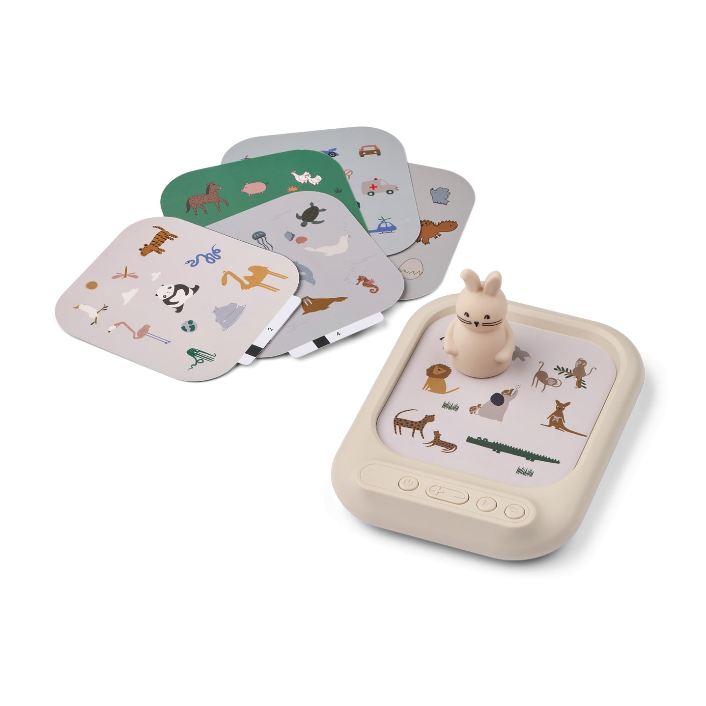 Stačí dol tabulky vložit jednu ze 6 tematických karet – od farmy přes les až po vesmír – a umístit figurku králíčka, aby se ozvaly odpovídající zvuky. Každé téma podporuje zvědavost, učení a smyslové vnímání dítěte.
