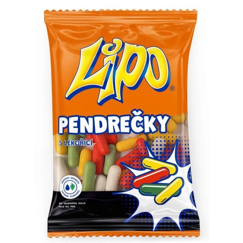 Lipo Pendrečky 60g Křupavé navrchu, měkké uvnitř. Vychutnejte nezaměnitelné spojení sladké ovocné a kořenité chuti. Barevné lékořicové válečky se sladkou cukrovou polevou. Složení: cukr, pšeničná mouka, třtinová melasa, částečně invertovaný cukrový sirup, voda, glukózový sirup, lékořicový extrakt, kukuřičný a rýžový škrob, rostlinné tuky (palmojádrový, palmový, Shea), maltodextrin, aromata, zahušťovadlo (arabská guma), jedlá sůl, barviva (karoteny, kurkumin, měďnaté komplexy chlorofylů a chlorofylinů), emulgátor (mono- a diglyceridy mastných kyselin), lešticí látka (karnaubský vosk), konzervant (sorban draselný). Průměrné výživové hodnoty 100g: Energetická hodnota 1568kJ / 368kcalTuk 1,1g / z toho nasycené mastné kyseliny 0,9gSacharidy 88g /z toho cukry 77gBílkoviny 2gSůl 0,21g