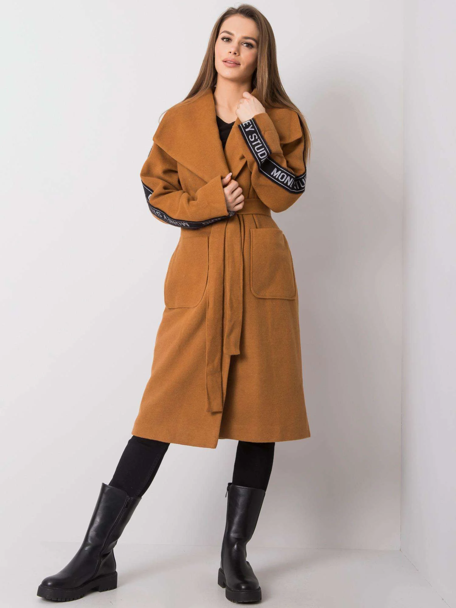 Světle hnědý dámský kabát s páskem. příslušenství: opasek Složení materiálu: 50 % vlna, 35 % polyester, 15 % elastan. způsob praní: chemické čištění Modelka má na sobě velikost 36. Rozměry modelky: výška 174 cm, prsa 87 cm, pas 61 cm, boky 89 cm. Rozměry kabátu velikosti 36 měřené na plocho: šířka v podpaží - 54 cm, celková délka - 112 cm, délka rukávu - 60 cmVelikost Alt.VýškaObvod hrudníku hrudníkExterní. délka. rukávVnitřní. délka rukávu36S160-16882594938M162-17286615140L164-17491635342XL166-178966555