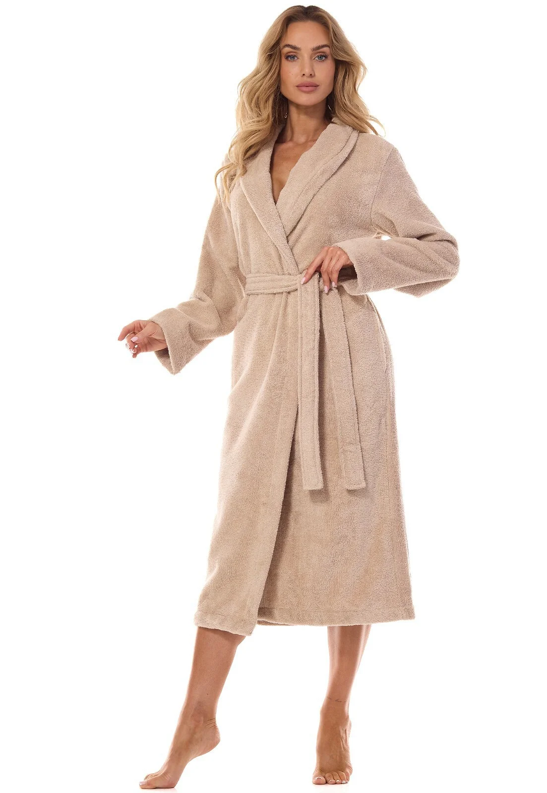 Dámský dlouhý župan - bavlněný froté úplet - šálový límec - zavazuje se v pase - boční kapsy Složení: 100% bavlna