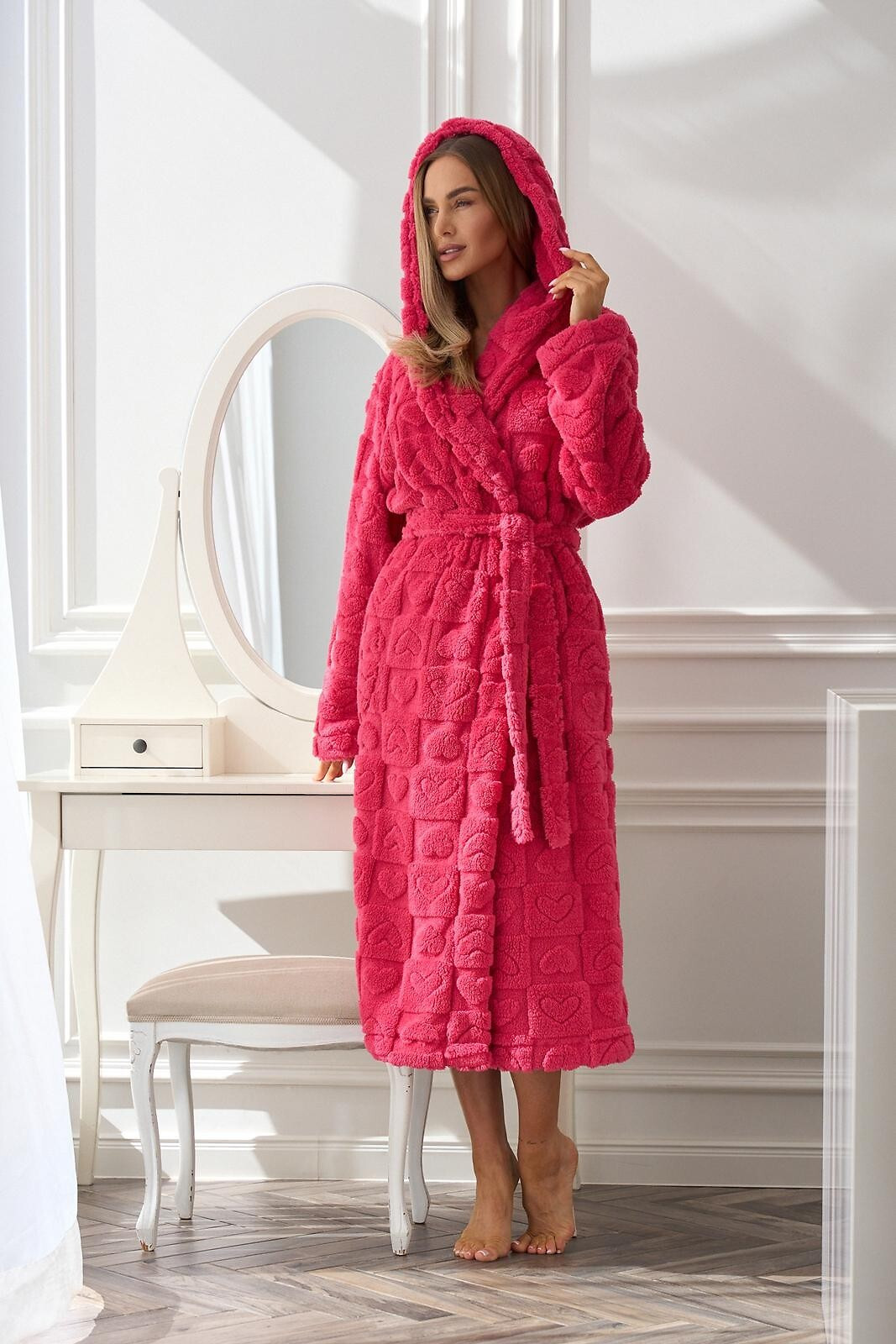 Dámský dlouhý župan s kapucí - měkká pletenina s reliéfním vzorem srdíček - dlouhé rukávy - zavazování v pase - pohodlné kapsy na bocích složení: 100% polyester