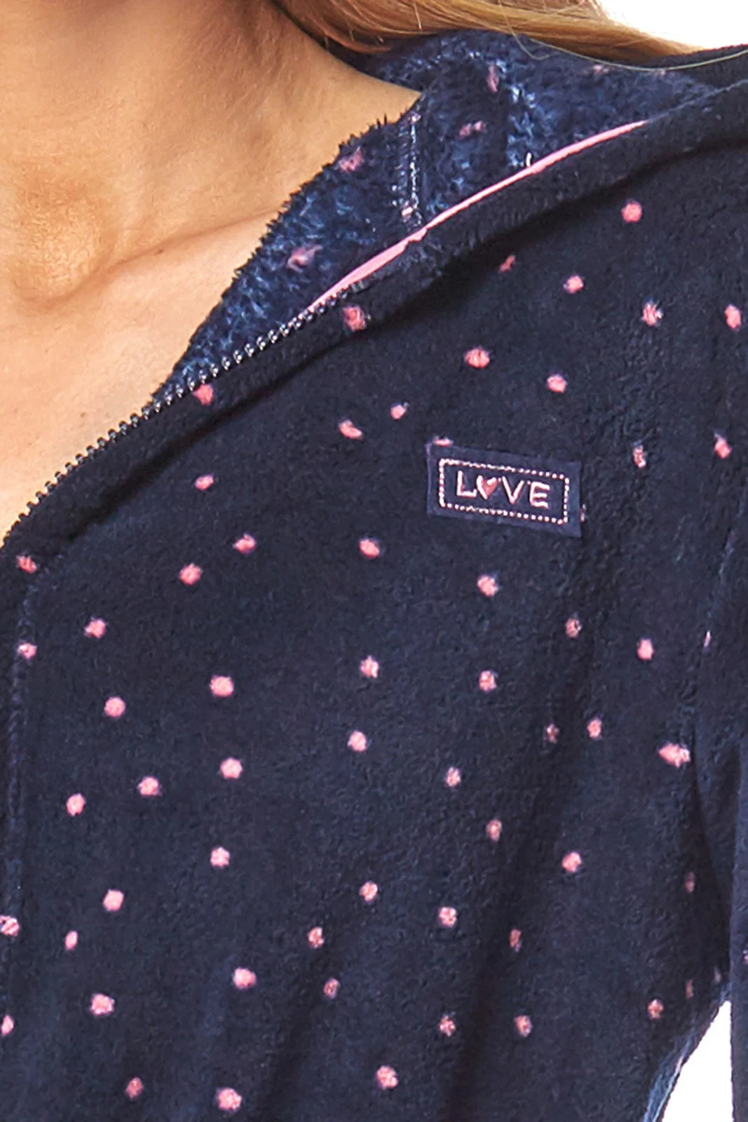 Pohodlný dámský župan - z měkkého puntíkovaného úpletu - s kapucí - zapínání na zip - jemná aplikace na hrudi - zavazování v pase - boční kapsy Složení: 100% polyester