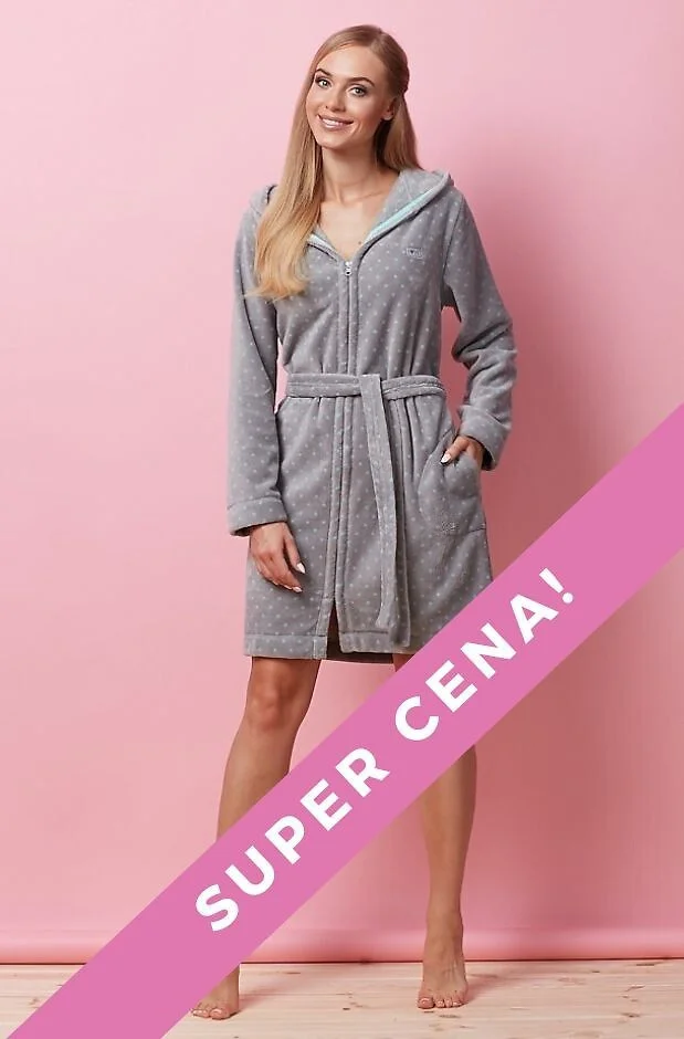 Pohodlný dámský župan - z měkkého puntíkovaného úpletu - s kapucí - zapínání na zip - jemná aplikace na hrudi - zavazování v pase - boční kapsy Složení: 100% polyester