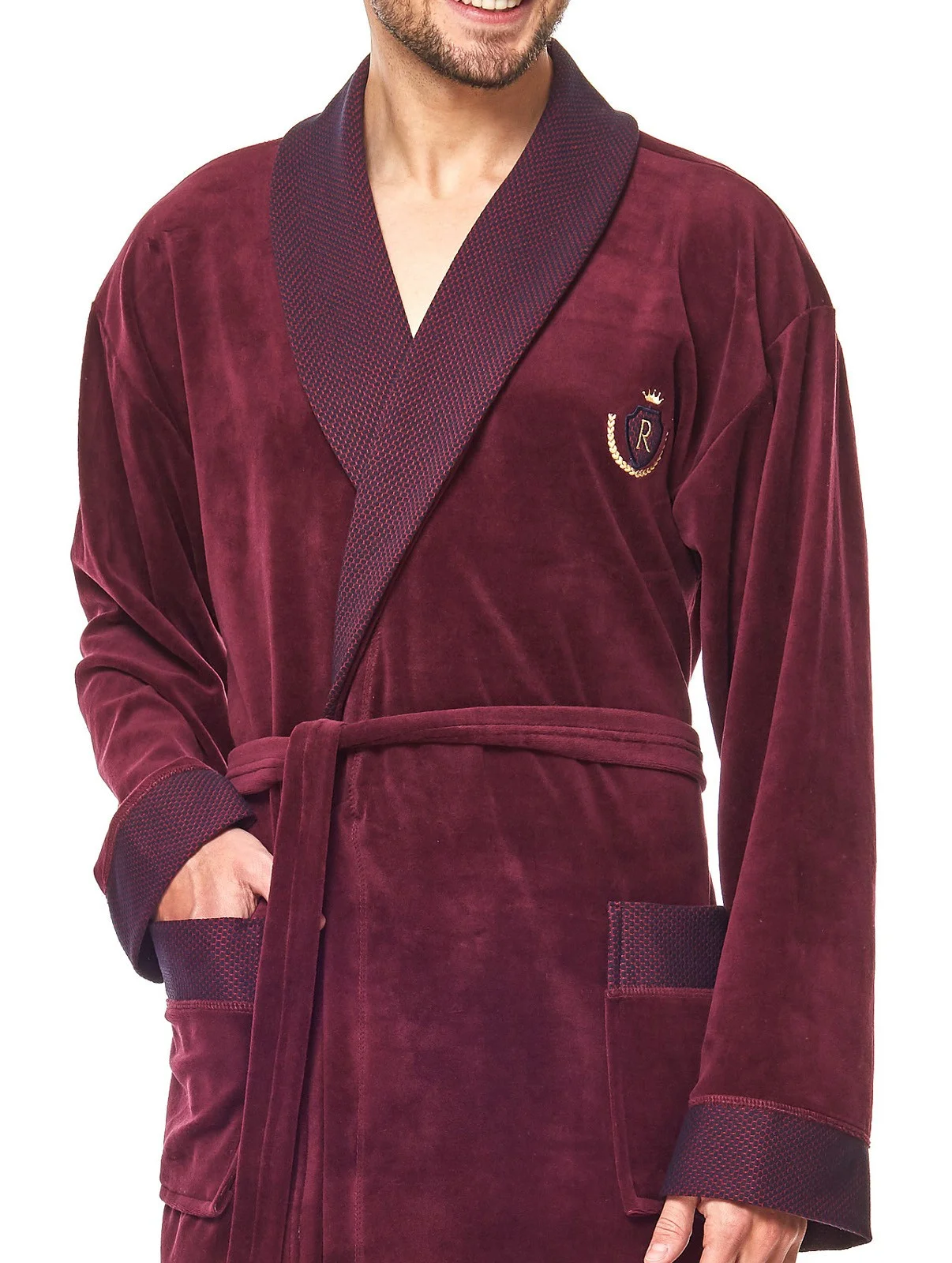 Pánský velurový župan - krátké, se šálovým límcem, zavazované v pase - dvě kapsy na úrovni boků - manžety, límec a kapsy ze vzorovaného úpletu nebo hladkého veluru - malá aplikace na úrovni hrudníku Složení: 80 % bavlna, 20 % polyester