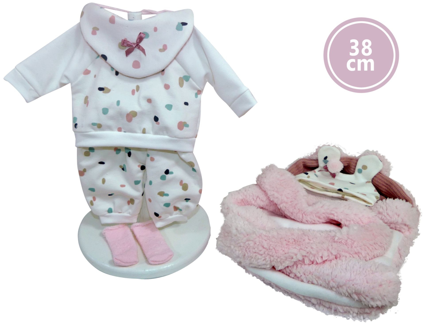 5dílný obleček s nosítkem pro panenku miminko Llorens velikosti 38 cm. Vyrobeno ručně ve Španělsku, baleno v igelitovém obalu s plastovým ramínkem. Doporučený věk od 3 let.