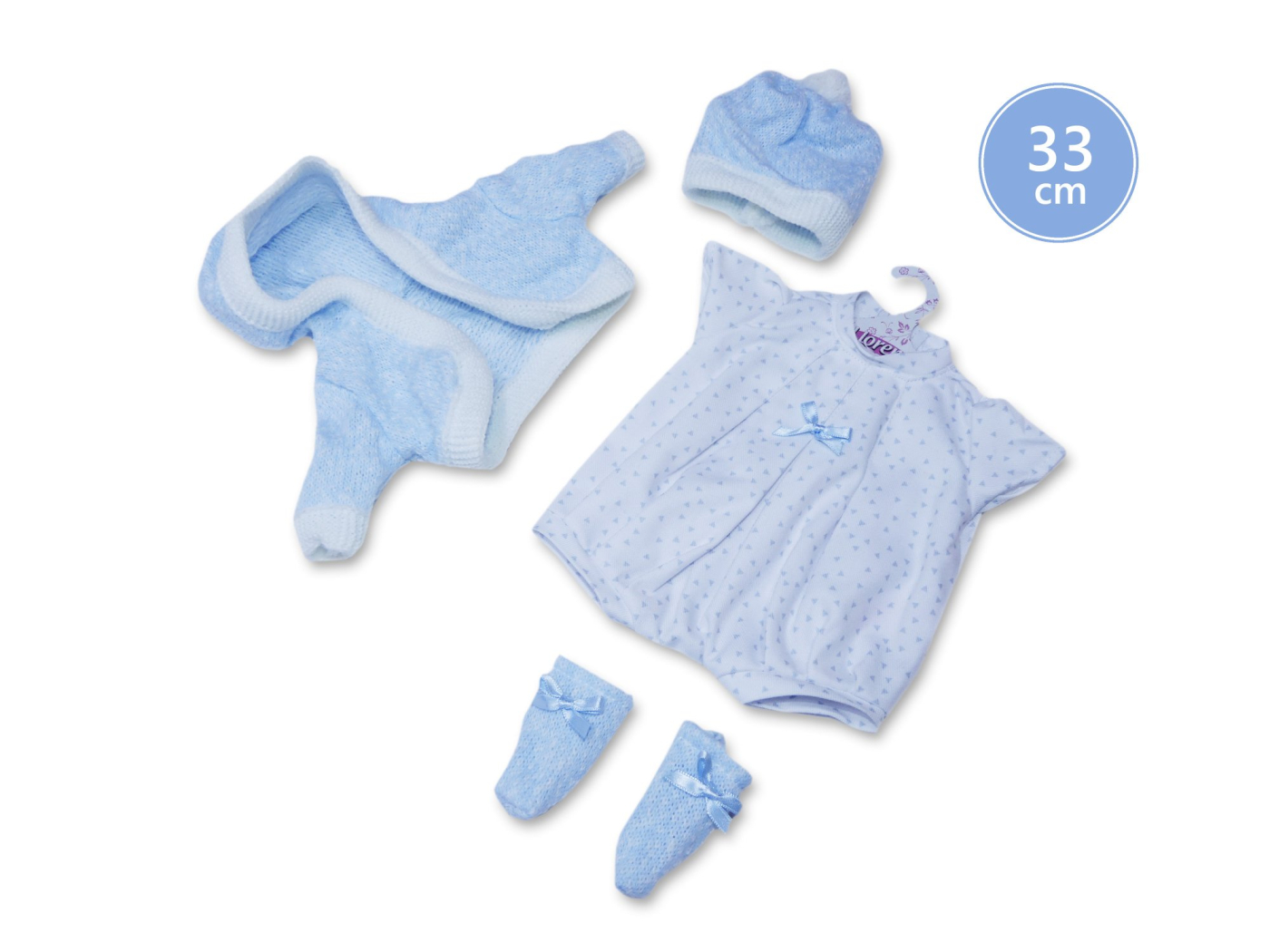4dílný obleček pro panenku Llorens velikosti 33 cm. Vyrobeno ve Španělsku, baleno v igelitovém obalu s plastovým nebo kartonovým ramínkem. Doporučený věk od 3 let.