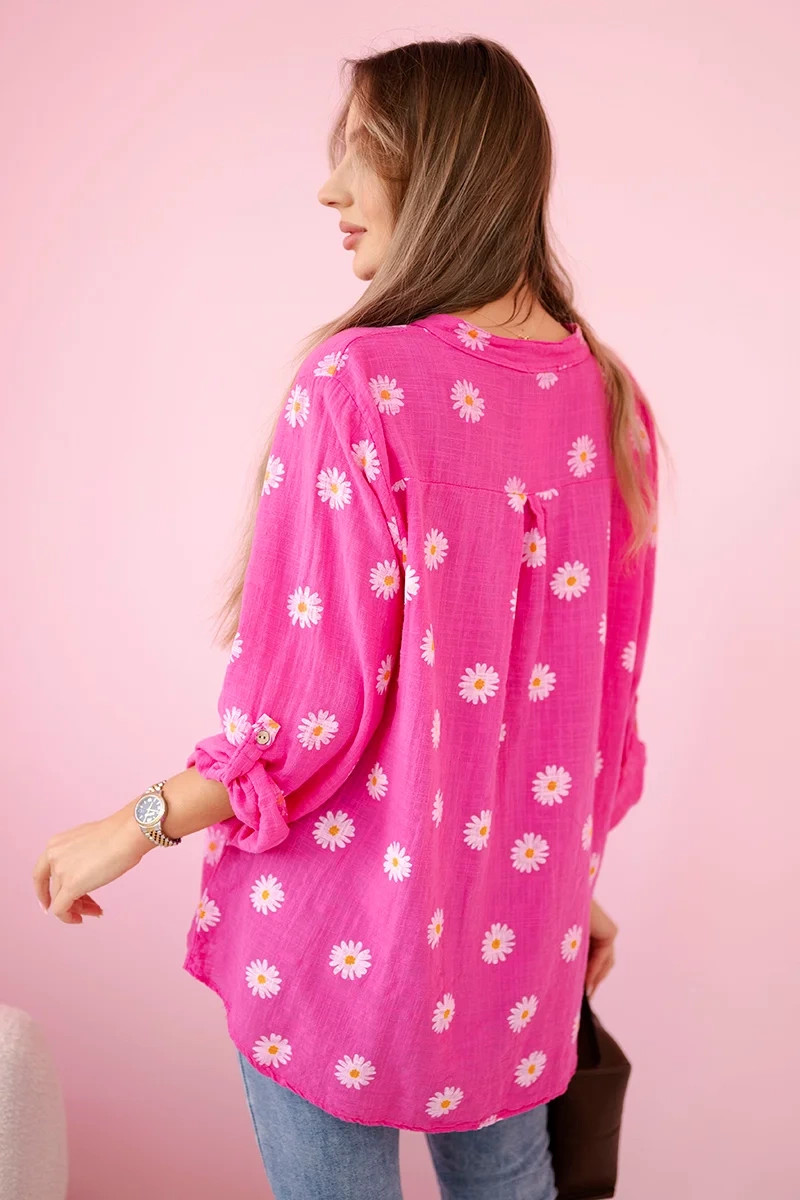 Lehká lněná dámská košilová halenka s květinovým vzorem Hledáte stylovou, pohodlnou a univerzální halenku? Tato košilová halenka s potiskem sedmikrásek je perfektní volbou pro každou příležitost! Je vyrobena z lehkého, prodyšného materiálu, který je ideální na jaro a léto. Volný střih zajišťuje volnost pohybu a jemný květinový vzor dodává ženský šarm. Dlouhé rukávy s možností ohrnutí umožňují různé způsoby nošení podle vašeho stylu. Proč si ji zamilujete? ✔ Módní a romantický květinový vzor✔ Prodyšný materiál – pohodlí po celý den✔ Volný střih – ideální pro ležérní i elegantní outfity✔ Nastavitelné rukávy – noste je dlouhé nebo vyhrnuté✔ Skvěle ladí s džíny, šortkami a sukněmi ✨ Přidejte ji do svého šatníku a užívejte si stylový vzhled pro každou příležitost! ITALSKÁ VÝROBA Složení materiálu: 100% Bavlna Rozměry (měřeno na plocho, +/- 1 cm)Pro získání obvodu vynásobte šířku x2. Rozměry halenky: Šířka pod pažemi: 61 cm Celková délka přední: 71 cm / zadní: 78 cm Délka rukávu od podpaží: 43 cm Pokyny k praní:Vždy si před praním přečtěte štítek na vnitřní straně oděvu. Prát max na 30°C Žehlit max na 110°C Nebělit ani nepoužívat chlór Chemické čištění benzínem Nesušit v sušičce