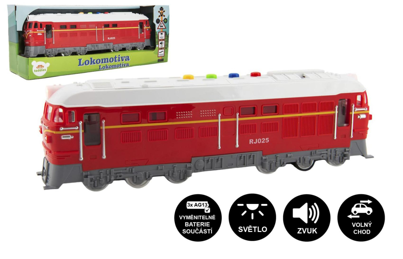 Vláčky patří k nejoblíbenějším hračkám po desítky generací. Krásná červená lokomotiva vydává klasické zvuky mašinky, svítí a jezdí na setrvačník. Skvělý tip na dárek pro malé strojvedoucí.