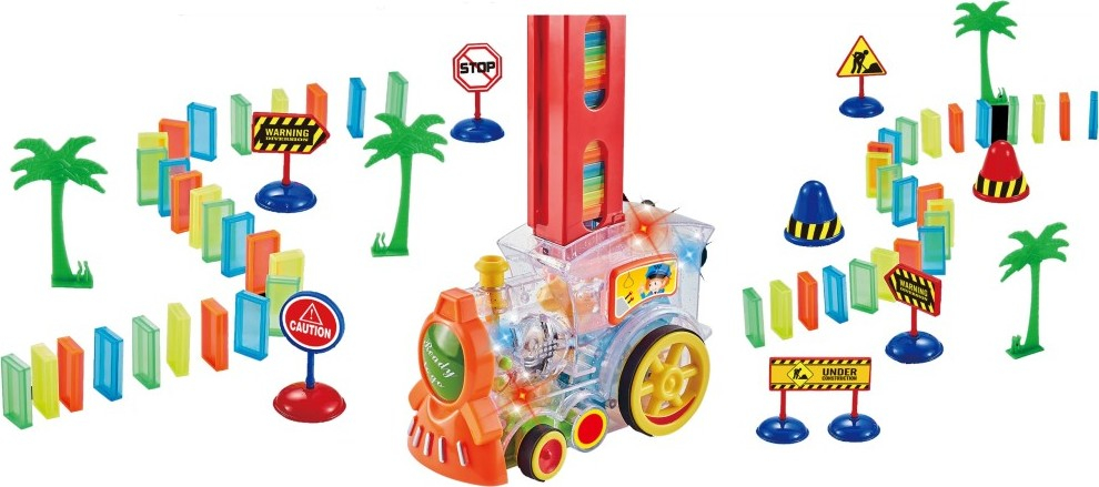 Lokomotiva s dominem se světelným a zvukovým efektem. Set obsahuje přes 98 kusů. Výrobek obsahuje LED světla. Rotující komín. Otevírací box na domino.