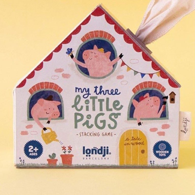 Dřevěné hračky od značky Londji vynikají propracovaností a překrásmými ilustracemi. Tato hra je na motivy pohádky o Třech prasátkách.