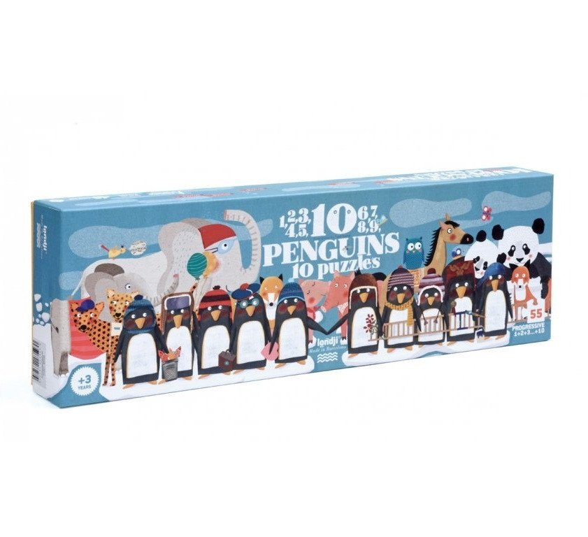 Krásná sada 10 obrázkových skládaček s tučňáky, kde se děti učí počítání hravou formou. Od španělské značky LONDJI.