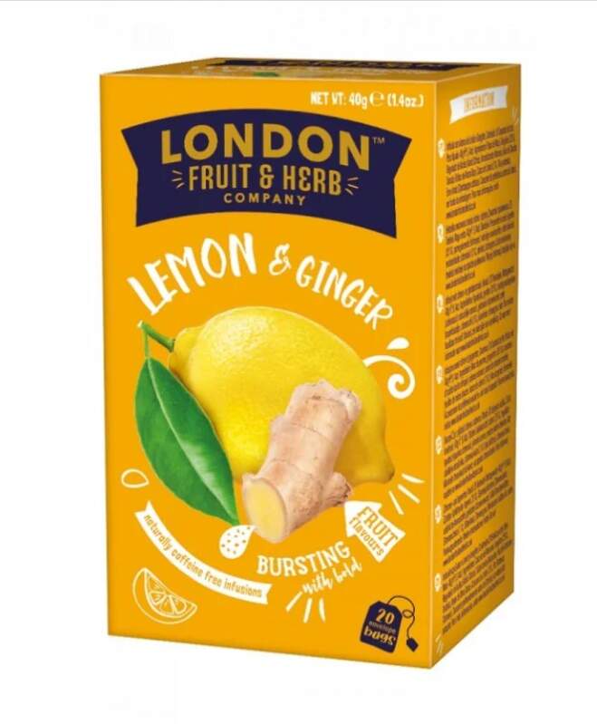 Citrón se zázvorem 20 sáčků Lehká, osvěžující chuť citrusů a jemně pikantního zázvoru, to je povzbuzující zážitek z tohoto čaje. V zimě zahřeje, ale také skvěle chutná chlazený v horkých letních dnech. Složení: Jablečná drť, zázvor (25 %), regulátor kyselosti (kyselina citronová), přírodní aroma, pražený kořen čekanky, listy sladkého ostružiníku, citronová kůra (1 %), lípa stříbrná, citronová tráva. Ovocné čaje London Fruit & Herb překvapí skvělou chutí a vůní a to bez přídavku cukru, bez umělých barviv a konzervačních látek, bez obsahu kofeinu. Obsahují pravé ovocné šťávy z koncentrátu a přírodní ovocná aroma. Díky těmto přísadám mají nejen skvělou chuť, ale i velmi příjemné, autentické ovocné aroma.