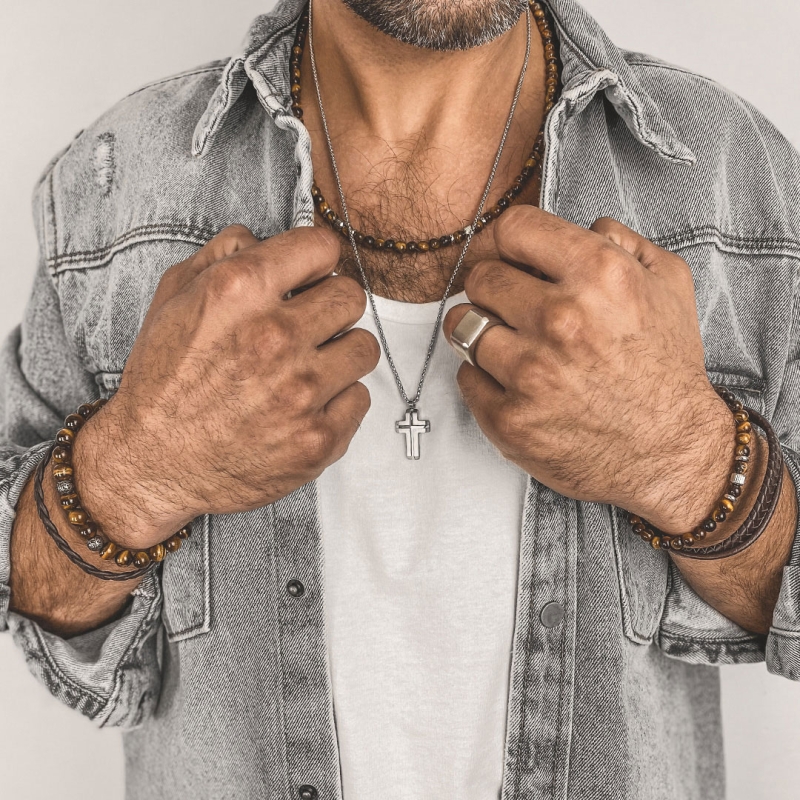 Tento elegantní set šperků pro muže kombinuje pravou kůži, přírodní kameny tygřího oka a chirurgickou ocel do jednoho sofistikovaného looku. Sada obsahuje kožené a korálkové náramky, korálkové náhrdelníky a ocelový prsten. Každý šperk byl navržen tak, aby přinášel nejen estetickou hodnotu, ale také dlouhou životnost a komfort při nošení. Kožené náramky v kombinaci s tygřím okem přidávají přírodní nádech a energii, zatímco ocelové komponenty zajišťují pevnost a moderní design. Náhrdelníky s korálky tygřího oka v teplých hnědých tónech dodávají outfitu charakter a perfektně ladí s ocelovým řetízkem a masivním prstenem. Tygří oko, známé svým leskem a ochrannými vlastnostmi, podtrhuje sílu a charisma nositele. Tento set je ideální pro muže s citem pro detail a styl. Skvěle se hodí k ležérním outfitům, jako jsou džíny a košile, ale zároveň dokáže doplnit i formální vzhled s košilí a sakem. Jednotlivé šperky lze kombinovat dle vlastních preferencí nebo zakoupit celý set pro ucelený vzhled, který podtrhne mužskou osobnost. 💡Tip: Každý šperk ze sady lze zakoupit jednotlivě nebo jako kompletní look, který dokonale podtrhne osobnost a styl nositele.