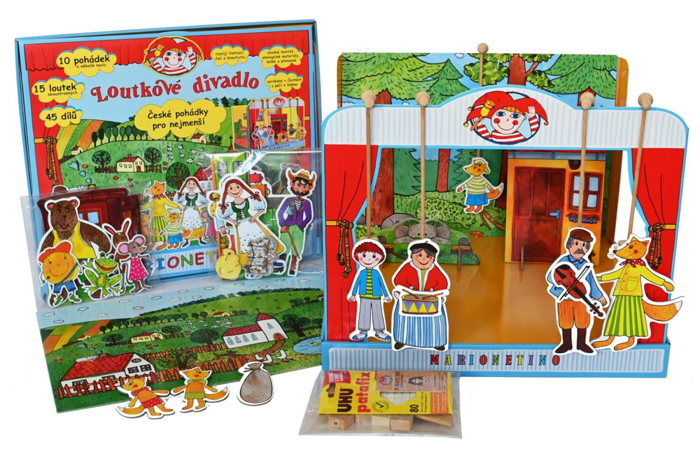 Loutkové divadlo České pohádky pro nejmenší je krásná sada, která potěší všechny malé i velké milovníky českých pohádek. Balení obsahuje skládací loutkové divadlo, 15 loutek, 5 dřevěných vodicích tyček, lepicí hmotu, rekvizity, 5 scén a scénické doplňky se stojánky. Součástí jsou také kódy ke stažení více než 10 scénářů k oblíbeným pohádkám, například Budulínek, Čert a Káča, Boudobudko, kdo v tobě přebývá a další. Vyrobeno z kvalitní knihařské lepenky, dřeva a laminovaného kartonu. Podporuje rozvoj řečových dovedností, fantazie, jemné motoriky a sebevyjadřování. Ideální pro první seznámení dětí s divadlem i pro rodinné hraní. Rozměry balení 48 x 42 x 6 cm Vhodné pro děti od 3 let