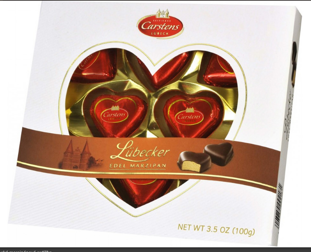 Lübecká marcipánová srdíčka 100g Jednotlivě balená srdíčka z jakostního mandlového marcipánu z Lübecku v lahodné hořké čokoládě. Když marcipán, tak z Lübecku! Složení: cukr, mleté mandle (37%), kakaová hmota, voda, kakaové máslo, emulgátor: sójový lecitin, zvlhčující látka: Invertáza. Může obsahovat lískové oříšky, vlašské ořechy, pistácie, ječmen, mléčné výrobky a vejce. Výživová hodnota na 100g výrobku Energetická hodnota 2036kJ/486kcal Tuky 29g z toho nasycené mastné kyseliny 6,7g Sacharidy 43g z toho cukry 42g Bílkoviny 9,8g sůl <0,01g