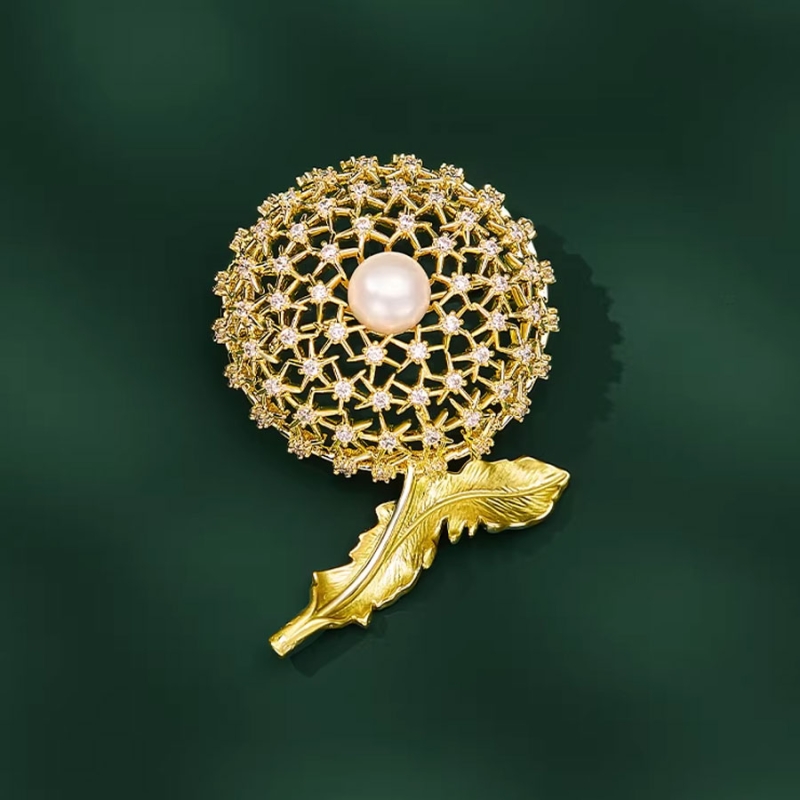 Jemnost, lehkost a kouzlo přírody – přesně tyto emoce probouzí luxusní brož ve tvaru rozevřené pampelišky. Její vzdušná a přitom detailně propracovaná kompozice je ozdobena jemnou sladkovodní perlou ve středu a desítkami drobných zirkonů, které se třpytí jako kapky rosy na letním slunci.Zlatavý tón kovu ladí s reliéfem listu i filigránovým výpletem květu, který evokuje fázi pampelišky těsně před tím, než zafouká vítr a jednotlivé padáčky se rozletí do světa. Brož je ztělesněním přání, naděje a krásných začátků – ať už jako osobní talisman nebo symbolické věnování.Díky elegantnímu designu se hodí ke klasickému černému saku i jemným šatům. Perla uprostřed dodává celku noblesu, zatímco zirkony přitahují světlo a pozornost s nevtíravou sofistikovaností. 💡 Tip: Tato brož září zejména na jaře – připomíná lehkost přírody a nový začátek, ideální doplněk na slavnostní oběd nebo velikonoční brunch.
