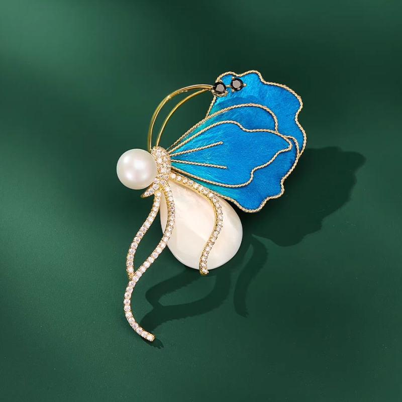 Vstupte do světa vysoké elegance s touto výjimečnou broží ve tvaru motýla, která propojuje jemnou krásu perleti s noblesním dotekem sametu. Každý detail byl vytvořen s důrazem na vytříbený vkus a smysl pro uměleckou harmonii. Výsledkem je šperk, který zaujme svou originalitou, noblesou i nevšedními materiály.Křídla tohoto luxusního motýla jsou tvořena sametovým textilním povrchem v odstínech zářivě modré s jemným zlatým obšitím – samet zde hraje roli nejen estetickou, ale i smyslovou, neboť vnáší do šperku měkkost a hloubku. Brož je vhodná pro ty, kteří hledají něco výjimečného – nejen výrazný módní doplněk, ale i osobní manifest stylu. Perfektně vynikne na klopě saka, večerních šatech nebo elegantní halence, kde dodá celý nový rozměr outfitu. 💡 Tip: Hodí se na slavnostní večeře, gala večery, módní události, vernisáže či jako jemné oživení minimalistického outfitu v práci.