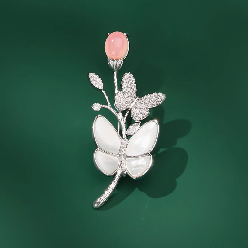 Působivá luxusní brož ve tvaru větvičky s motýlem zaujme precizním zpracováním a ladností přírodních motivů. Bílý motýl s křídly z jemně duhové perleti elegantně kontrastuje s drobnými třpytivými lístky, zatímco horní růžový kámen dodává celé kompozici romantický akcent.Lesklý stříbrný tón kovu podtrhuje svěžest celého šperku a vytváří dokonalý rám pro jemné detaily – třpytivé zirkony, kapkovité listy i perlové akcenty. Celek působí jako poetické vyjádření jara, čistoty a ženské elegance.Díky své neutrální barevnosti a sofistikovanému provedení se brož hodí jak k minimalistickým bílým či černým outfitům, tak k jemným pastelům. Je ideálním doplňkem pro denní nošení, svatební příležitosti i slavnostní večery. 💡 Tip: Noste tuto brož na bílé košili nebo saku – jemné kontury motýlích křídel krásně vyniknou na světlém podkladu.