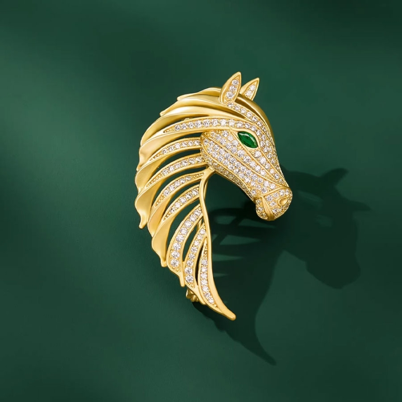 Tato luxusní brož ve tvaru koňské hlavy je vyjádřením síly, elegance a hrdosti – přesně takových, jaké ztělesňuje vznešené zvíře, kterým se inspirovala. Precizně propracované linie hřívy, osazené drobnými čirými zirkony, vytvářejí působivý lesk a dodávají šperku nezaměnitelný charakter. Oko koně je zvýrazněno zeleným krystalem, jenž do designu vnáší hloubku i živost.Zlatý tón kovu navozuje dojem luxusu a noblesy, čímž brož působí jako šperk hodný skutečné dámy s vytříbeným vkusem. Díky detailnímu zpracování a harmonii lesku a tvaru se stává nejen ozdobou, ale i výpovědí – o odvaze, důstojnosti i vášni. Je ideální volbou pro ženy, které milují osobitost a symbolické šperky.Vynikne na klopě saka, hedvábném šátku i jako výrazný akcent na večerní róbě. Zaujme při slavnostních příležitostech, na galavečerech, ale i jako jedinečný doplněk do kanceláře či na stylové dostihové odpoledne. Brož, která nezůstane bez povšimnutí. 💡 Tip: Tuto brož doporučujeme připnout na černý vlněný kabát nebo tmavý blazer – kontrastní kombinace nechá vyniknout zlatý lesk i jiskru zirkonů.