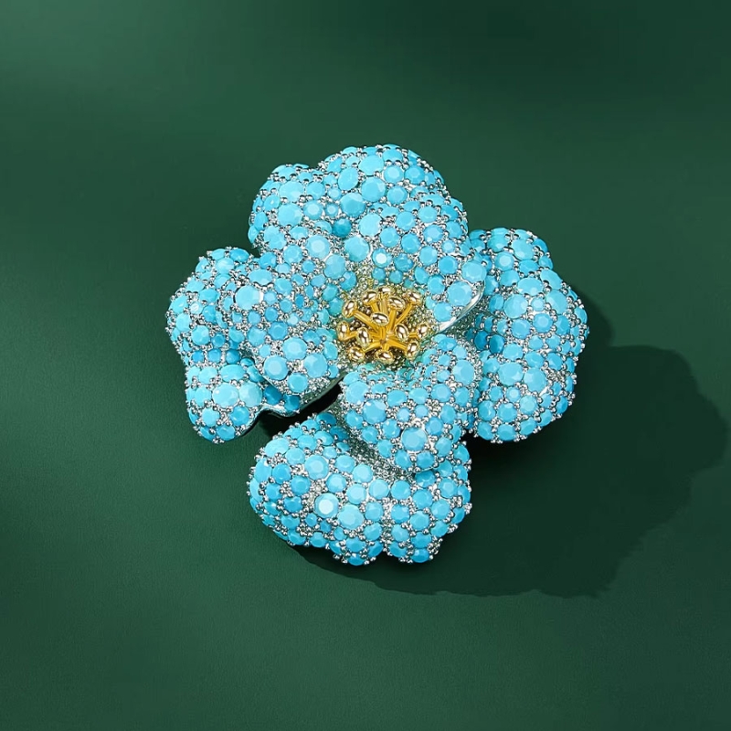 Brož ve tvaru rozkvetlého květu zaujme svou majestátní krásou a dokonale propracovaným tvarem. Zářivé tyrkysové zirkony vyplňují jednotlivé okvětní lístky a vytvářejí fascinující souhru lesku a barevné hloubky. Zlatý střed ve tvaru pestíku pak celému šperku dodává královský dotek a harmonii.Tyrkysová barva symbolizuje klid, ochranu a duševní rovnováhu – ideální volba pro ženy, které touží po eleganci s jemně spirituálním nádechem. Tato brož osloví nejen milovnice šperků, ale i ženy s vytříbeným smyslem pro detail, které hledají něco jedinečného a osobitého.Díky své velikosti a nápadnosti se brož hodí pro slavnostní události, ale i jako výrazný prvek minimalistického outfitu. Lze ji připnout na šaty, sako, kabát nebo i na šál – vždy dodá celku výraz osobnosti a stylu. 💡 Tip: Vynikne i jako originální ozdoba na klopě blejzru – decentně, ale nezaměnitelně podtrhne váš osobitý vkus.