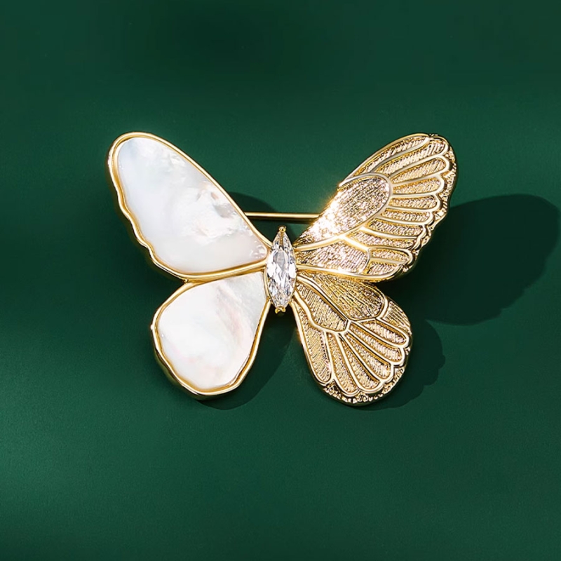 Luxusní brož ve tvaru motýla okouzlí svým detailním zpracováním a kombinací jemného perleťového lesku s elegantní zlatou úpravou. Dvě křídla jsou vyplněna perletí, která dodává šperku jemnost a půvab, zatímco druhá polovina křídel je precizně vyřezávaná do zlatého kovu s jemnými strukturálními detaily.Uprostřed brože se nachází podlouhlý čirý zirkon broušený do tvaru marquise, který tvoří pomyslné tělo motýla a jemně odráží světlo. Tento detail dodává broži jemnou jiskru a zdůrazňuje její luxusní vzhled. Celkový design působí lehce a vzdušně, přesto však zůstává výrazný.Brož je ideální volbou pro slavnostní příležitosti, večírky nebo jako stylový akcent k elegantnímu saku. Díky motivu motýla symbolizuje svobodu, radost a krásu života. Perfektní doplněk pro ženy, které chtějí podtrhnout svou jedinečnost a vytříbený vkus. 💡Tip: Tuto brož doporučujeme připnout na klopu černého saka nebo kabátu, kde vynikne její zlatý lesk a jemné perleťové tóny. Krásně doladí i jednoduché večerní šaty nebo elegantní halenku.