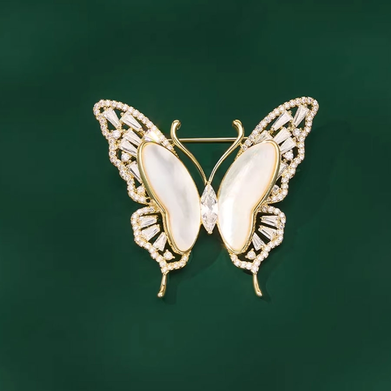Tato okouzlující brož ve tvaru motýla zaujme na první pohled svou jemností a elegancí. Křídla z perleťově bílého materiálu rámují zlaté kontury, zatímco jemné zirkony a geometrické kamínky vytvářejí fascinující třpytivý efekt. Luxusní provedení a precizní zpracování dělají z tohoto šperku skutečný klenot s nádechem noblesy.Motýlí silueta symbolizuje transformaci, krásu a svobodu – ideální volba pro ženy, které chtějí vyjádřit svou vnitřní sílu s lehkostí a grácií. Díky harmonické kombinaci zlatého tónu a perleťových odlesků se brož stává výjimečným detailem, který doladí i ten nejjednodušší outfit.Vynikne jak na klopě černého saka, tak na jemné látce šatů či šálu. Je ideální pro večerní události, slavnostní příležitosti nebo jako sofistikovaný doplněk do pracovního dne, kdy chcete zazářit s vkusem. 💡 Tip: Připněte brož na klopu černého saku nebo kabátu, kde vynikne její jasný třpyt a jemná silueta motýla.