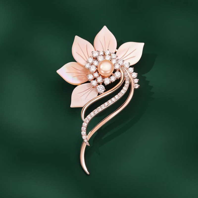 Tato luxusní brož je poctou vytříbené kráse a precizní šperkařské práci inspirované jemností květu orchideje. Organický tvar květu působí lehce a vzdušně, zatímco pečlivě tvarované linie dodávají celku noblesní charakter. Každý detail je promyšlený tak, aby brož působila jako malý umělecký objekt s výrazným estetickým přesahem.Dominantou brože je perla zasazená do středu květu, obklopená třpytivými kameny, které zachycují světlo s jemnou elegancí. Růžově laděné kovové linie plynule navazují na květinový motiv a vytvářejí dojem pohybu a přirozené harmonie. Celek působí luxusně, ale nikoli okázale – přesně v duchu haute couture šperků.Brož je ideálním doplňkem pro ženy, které milují originální detaily a chtějí dodat svému outfitu výjimečný akcent. Hodí se ke společenským šatům, elegantnímu saku i minimalistickým outfitům, kde se stane středem pozornosti. Je to šperk, který podtrhne osobnost a cit pro krásu. 💡 Tip: Kombinujte ji s jednoduchým černým nebo bílým kostýmem. Luxusní brož dodá střídmému vzhledu výraz a promění ho v sofistikovaný outfit.