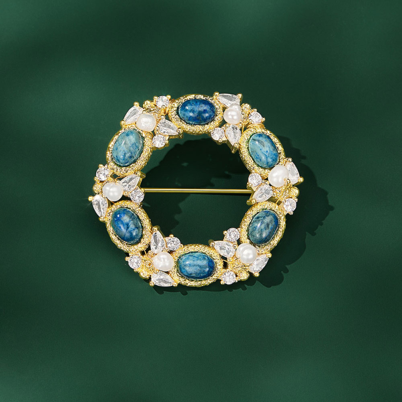 Tato luxusní brož v podobě bohatě zdobeného věnce působí slavnostně, noblesně a mimořádně ženským dojmem. Kompozice modrých oválných kamenů, jemných perel a třpytivých zirkonů vytváří harmonický celek, který připomíná šperk s aristokratickým půvabem. Zlatý tón podkladu dodává broži hřejivost a luxusní vyznění, zatímco věncový motiv jí propůjčuje dekorativní krásu a nadčasový charakter.Právě tvar věnce dává této broži její jedinečnou atmosféru. Nepůsobí stroze ani geometricky, ale slavnostně, ušlechtile a jemně reprezentativně. Modré kameny do designu vnášejí hloubku a klid, perly změkčují celkový výraz a zirkony přidávají světlo, které se při každém pohybu jemně rozzáří. Výsledkem je šperk, který zaujme, ale nikdy nepůsobí těžce nebo okázale.Brož nádherně vynikne na klopě saka, elegantního kabátu, společenských šatů i slavnostní halenky. Je to doplněk pro ženy, které si potrpí na vytříbené detaily a chtějí do svého stylu vnést noblesu, jemný lesk a dekorativní prvek s výjimečným kouzlem. Tento věnec není jen ozdobou, ale stylovým podpisem celého outfitu. 💡 Tip: Věnec bývá symbolem harmonie, krásy, celistvosti a slavnostního okamžiku. I proto je tato brož krásným dárkem pro ženu, které chcete věnovat něco elegantního, reprezentativního a zapamatovatelného.