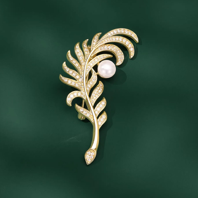 Tato luxusní brož v podobě stylizovaného pírka působí lehce, elegantně a zároveň mimořádně sofistikovaně. Zlacené linie jemně kopírují tvar peří, jsou osazeny drobnými třpytivými kamínky a doplněny perlou, která šperku dodává noblesní akcent a nadčasovou krásu. Celek působí harmonicky, vzdušně a velmi ženským dojmem.Design brože je promyšlený do posledního detailu – křivky pírka vytvářejí dojem pohybu a lehkosti, zatímco třpyt krystalů zachytává světlo s jemnou elegancí. Perla zde nepůsobí okázale, ale naopak klidně a vyváženě, jako tichý střed celého motivu. Brož je ideální volbou pro ženy, které milují výrazné, ale kultivované doplňky.Tento šperk se skvěle hodí jako solitérní ozdoba saka, šatů nebo večerního topu. Dokáže dodat osobitost minimalistickému outfitu i podtrhnout slavnostní styl. Je to brož, která nepodléhá trendům a zůstává krásná i po letech – přesně ten typ doplňku, který se stává součástí osobního stylu. 💡 Tip: Brož vynikne na tmavém saku, sametových šatech nebo elegantním overalu. Díky perle a jemnému třpytu je ideální na společenské události, večírky či formální večeře.