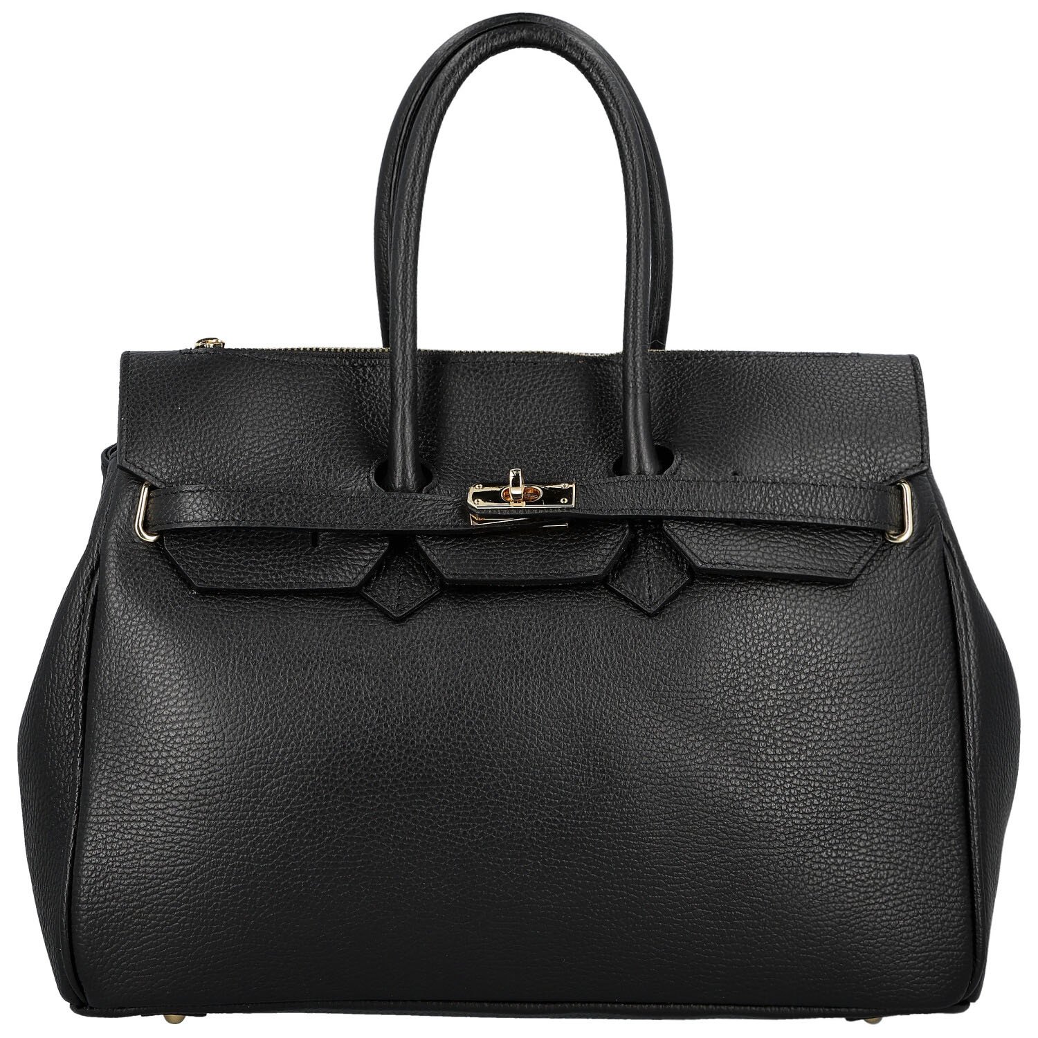 Její tvarově pevné tělo z kvalitní strukturované kůže působí sofistikovaně a nadčasově. Přední stranu zdobí stylová klopa se zlatým zámečkem, který kabelce dodává nádech exkluzivity. Praktickou vychytávkou je zip ve vrchní části, do kabelky se tak pohodlně dostanete i bez otevření klopy.