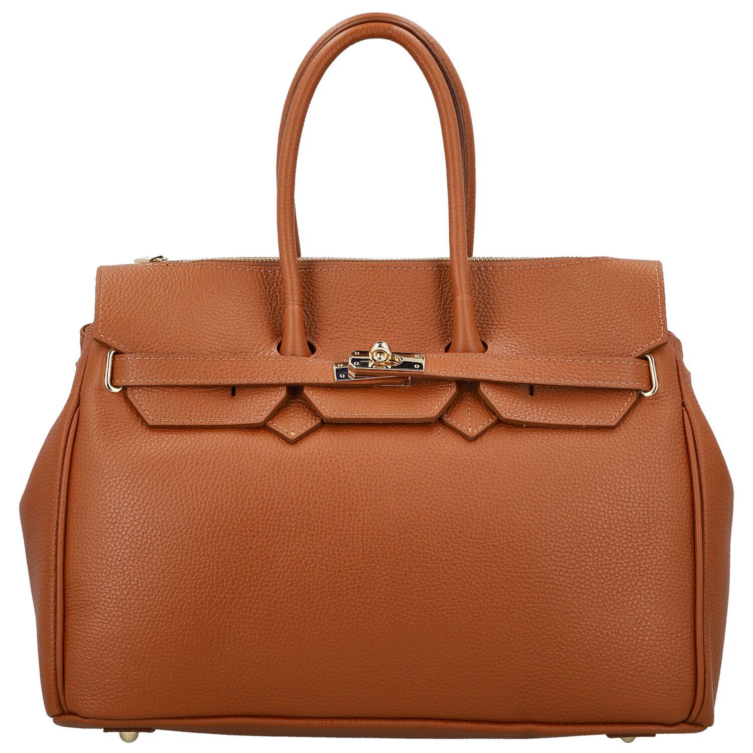 Její tvarově pevné tělo z kvalitní strukturované kůže působí sofistikovaně a nadčasově. Přední stranu zdobí stylová klopa se zlatým zámečkem, který kabelce dodává nádech exkluzivity. Praktickou vychytávkou je zip ve vrchní části, do kabelky se tak pohodlně dostanete i bez otevření klopy.